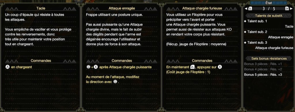 | Concentration | Focus | 1/2/3 | 1 | Diminue le temps de charge des attaques chargées. Diminue aussi cela dit la durée pendant laquelle vous pouvez être frappé et donc buffé en chargeant l’attaque enragée |