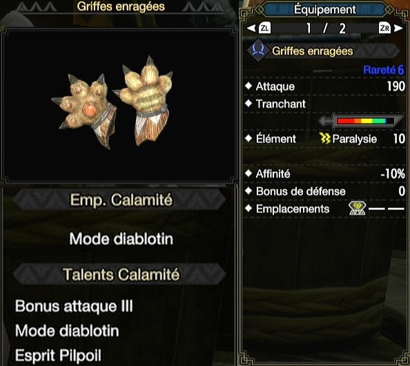 Le Mode Diablotin est très simple: si tôt que vous passez en mode démoniaque, vous passez à 100% d’affinité mais vous consommez deux fois plus de tranchant. Et comme ces lames doubles ont le tranchant blanc après seulement un niveau de Savoir-faire et qu’on peut contrebalancer la double consommation de tranchant avec Acier trempé, on a pas mal de potentiel.
