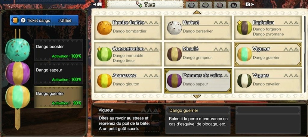 - Dango guerrier: Réduit votre consommation d’endurance de 20% lors des esquives, très pratique pour les armes gourmandes en endurance.