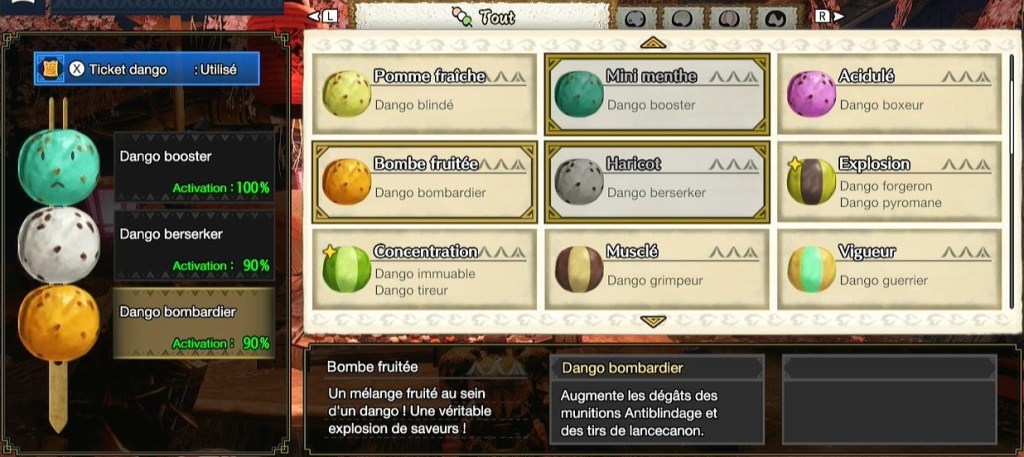 - Dango booster: Augmente votre attaque pendant 10 minutes en début de quête, un classique.