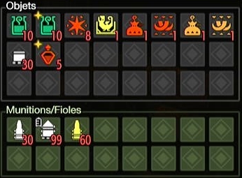 | Max de munitions | Ammo Up | 2 | 1 | Agrandit à 3 les chargeurs de Tranchantes et de Foudre Perf. (les munitions élémentaires et Tranchantes sont considérées comme des munitions II) |
