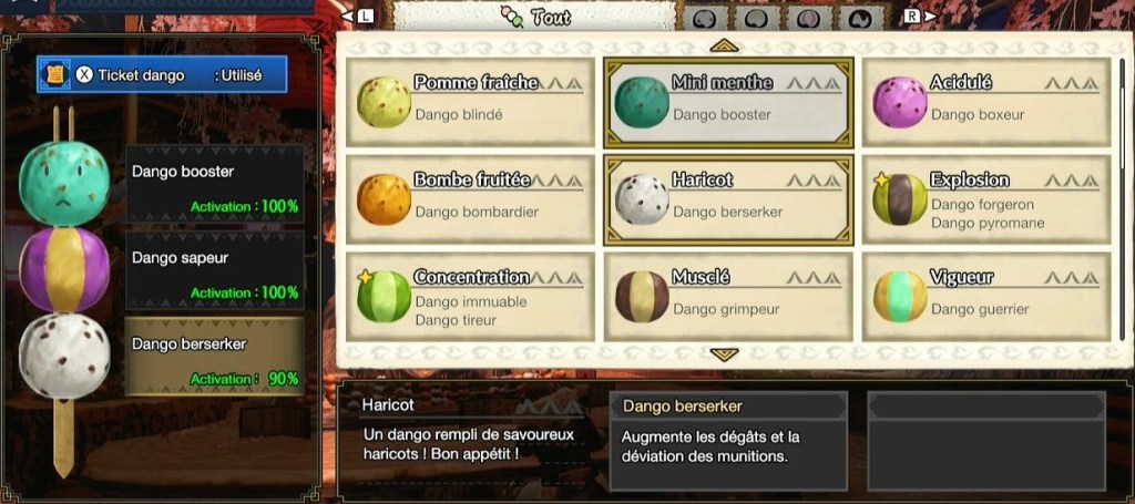 - Dango booster: Augmente votre attaque pendant 10 minutes en début de quête, un classique.