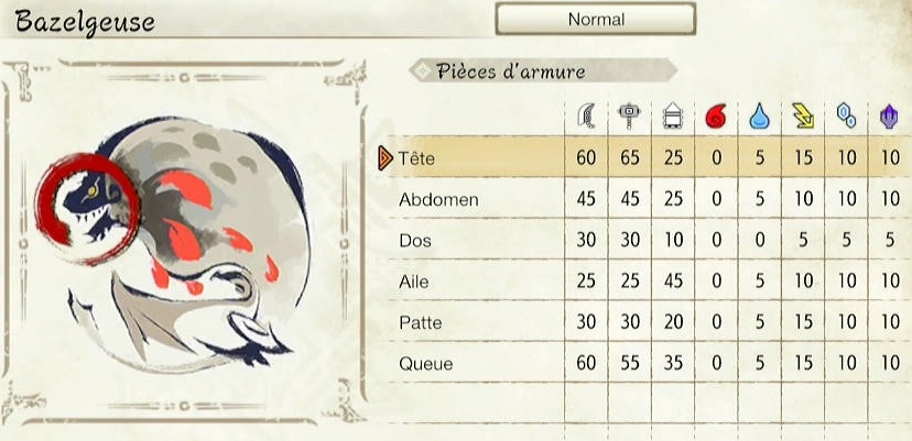 Et c’est là qu’arrivent les munitions Tranchantes. Elles tirent une projectile qui se colle au monstre puis explose en mettant trois coups tranchants. Et comme vous le voyez sur l’image en-dessous, la différence peut être violente entre hitzone de tir et tranchante. La Bazelgeuse et le Mizutsune supérieur passent d’une hitzone à la tête de 25 au tir à 60 au tranchant. Un petit saut dans le Compendium peut vous permettre d’identifier les nouveaux points faibles des monstres avec ce build.