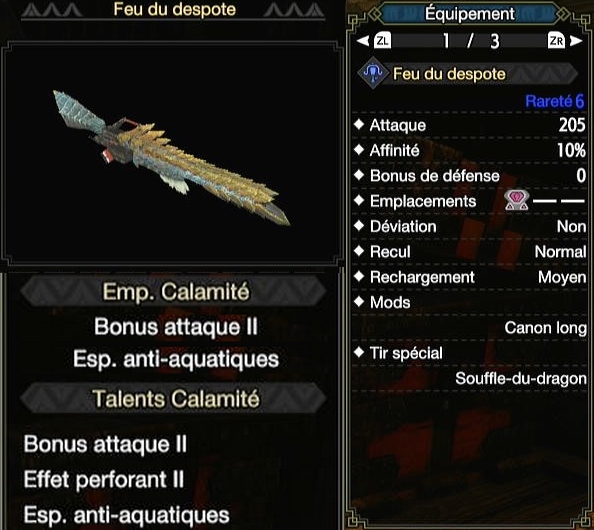 Ce LBG dispose de munitions Normales III et Foudre Perf. en tir rapide, vous offrant une solution quand les Tranchantes manquent. Le Talent Calamité dépend du monstre sur lequel vous exploitez le set. En effet, Esp. anti-aquatiques donne 10% de dégâts supplémentaires sur les Leviathans, les Amphibiens et les Wyvernes aquatiques, craignant quasiment tous les Foudre Perf., mais ne sert à rien contre le reste du roster. Dans ces cas, Bonus attaque II est un meilleur choix. La solution idéale est d’avoir 2 LBG Zinogre avec chacun un des talents Calamité.