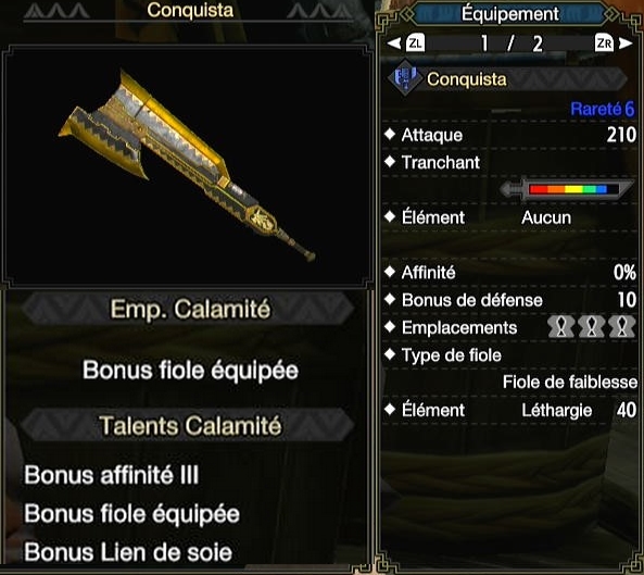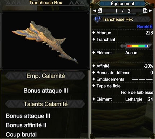 La meilleure SA avec des fioles de faiblesse sur le plan des dégâts en sans aucun doute la SA Tigrex. Bonus attaque III est sa meilleure option en talent Calamité.