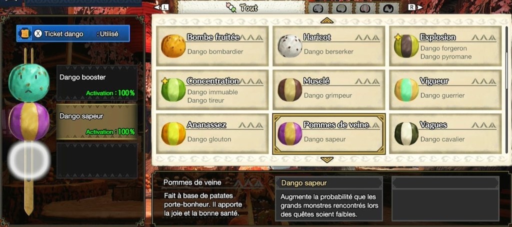 - Dango booster: Augmente votre attaque pendant 10 minutes en début de quête, un classique.