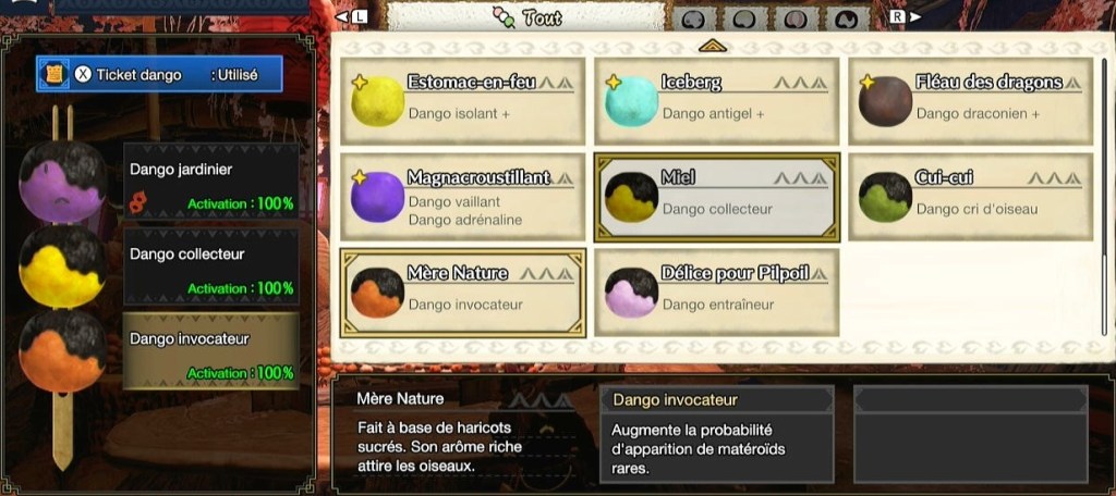 - Dango collecteur: Permet de récolter plus de Miel. Des fois que vous le farmez pas avec les Palicos?
