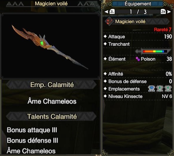 Encore une fois, aucune arme recommandée en particulier. Au mieux, je recommanderais une arme avec beaucoup de slots pour ajouter des décorations et du poison pour farmer les Neopterons, ce qui laisse la GS Remobra, la GS Chameleos, les DB Chameleos, la lance Remobra, le marteau Wroggi, la HH Chameleos et l’IG Chameleos.