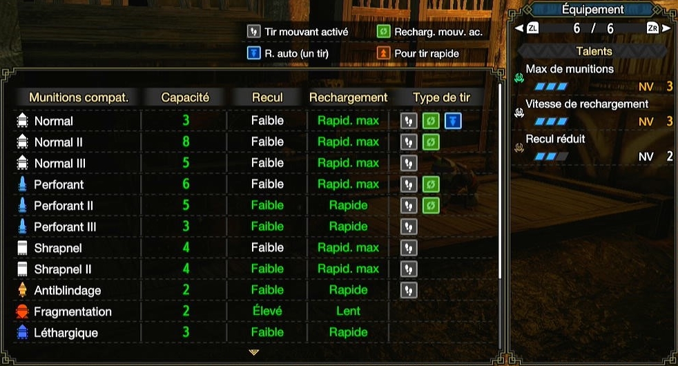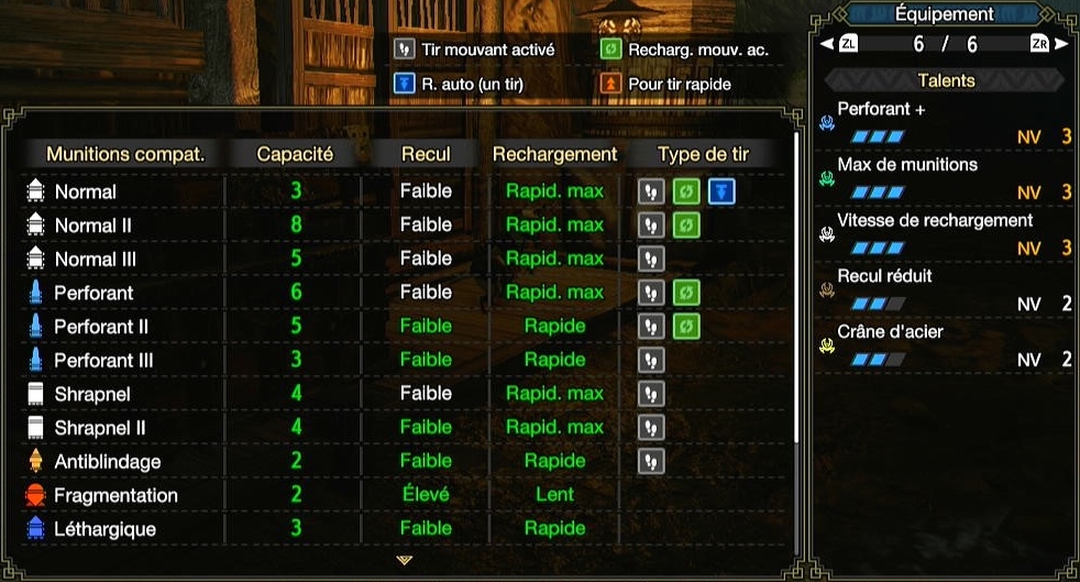 L’étape suivante est de perfectionner votre tir. Pour tirer rapidement, il faut passer le moins de temps possible bloqué par le recul d’un tir ou dans une animation de recharge. Les talents Vitesse de rechargement et Recul réduit sont donc la base sur un build fusarbalète. Dans votre équipement, presser Y permet de voir les munitions de votre arme et leur recul et vitesse de recharge. Il faut avoir un recul Faible et une vitesse de rechargement Rapid.min.