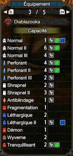 Pour les besoins de la démonstration, je vais prendre le HBG Diablos, une arme clairement pas adaptée mais qui me permet de couvrir un peu tout. Ce HBG a donc: