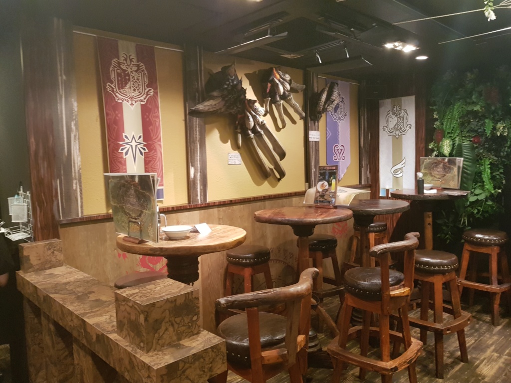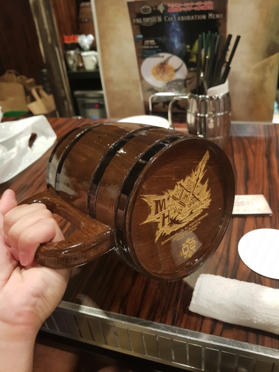 Le Bar vend quelques goodies, achetables via la tablette. On y retrouve des trucs communs type figurine en plus cher que dans des magasins généralistes évidemment mais aussi des goodies exclusives. On peut citer des puzzles, des coques de téléphone mais aussi et surtout la tasse MH! Tasse qu’il faut commander 3 mois à l’avance et qui coûte 100 ou 200e selon la contenance de 1 ou 2L… Personnellement j’avais ni le temps ni l’argent mais le Français d’Osaka a réussi à en négocier une de 2L dans le Capcom Bar de Saitama. En gros, c’est du collector : ça coûte un rein mais c’est joli et ultra rare donc c’est selon vos convenances.