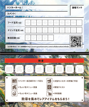 Toujours à votre service, je vous traduis les objectifs de la première carte (ou plutôt j’essaie et de toute façon j’ai pas les suivantes). Premier objectif, je suppose « remplir une fiche de présentation ». Deuxième, boire une boisson sucrée. Troisième commander un plat épicé. Quatrième, faire une chasse sur console. Cinquième à septième… Ça s’appelle « quêtes urgentes » je crois que ce sont des objectifs à faire spécifiques type « manger ce plat-là » (affichés sur le tableau à l’entrée). Ça peut aussi être les menus temporaires. Et pour finir, huitième je pense que c’est « partager une photo sur les réseaux sociaux ». Mais pas sûr à 100%. Attention, il faut signaler au vendeur que vous avez rempli l’objectif.