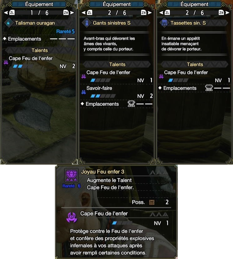 Si vous voulez vous amuser avec le talent, il est presque indispensable d’avoir au moins un talisman Cape Feu de l’Enfer 2. La question ensuite, c’est niveau 3 ou niveau 4. Vous pourrez donc soit récupérer un niveau avec les bras Magnamalo, une pièce assez populaire pour avoir Savoir-faire avec les armes épéistes, soit mettre une décoration approprié qui prendra cela dit un slot 3. Ca tombe bien remarque, la tassette Magnamalo possède un slot 3 en plus d’un niveau du talent et peut donc être une solution pour atteindre le niveau 4 dans un set.