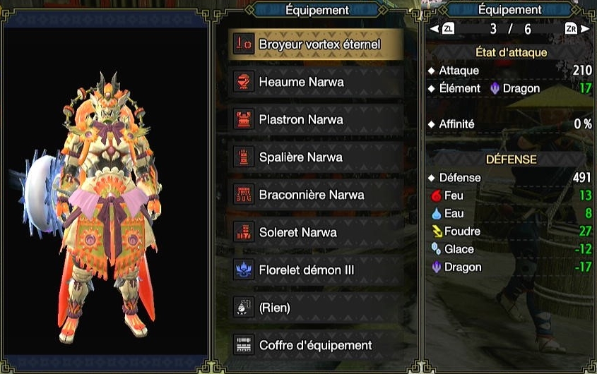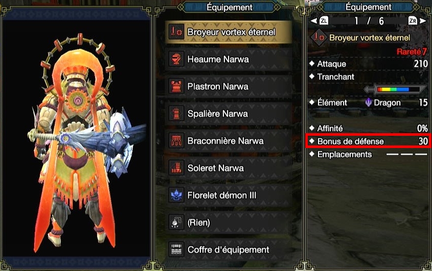 Pour les armes Ibushi, Âme Ibushi leur donne un bonus de défense de +10 avec une pièce Narwa, avec une augmentation de +5 par pièce supplémentaire. Porter le set Narwa entier vous donne donc 30 de défense en plus. Entre Esp. anti-aériennes (+5% de dégâts sur les monstres volants) et Bonus Dragon IV, la question elle est vite répondue.