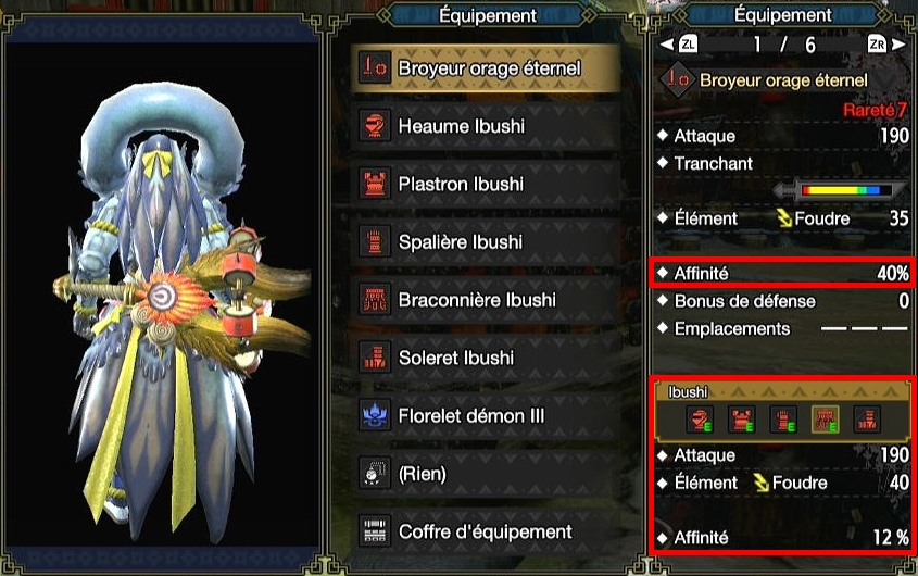 Pour les armes Narwa, Âme Narwa est bien plus puissant puisqu’il est orienté offensivement. La première pièce Ibushi vous offre 4% d’affinité, la seconde monte ça à 6%, la troisième à 10%, la quatrième à 12% et les 5 pièces à un massif 40%. Sans Berserker, 40% d’affinité équivalent à 10% de dégâts en plus… Sauf qu’il faut absolument que des pièces Ibushi.