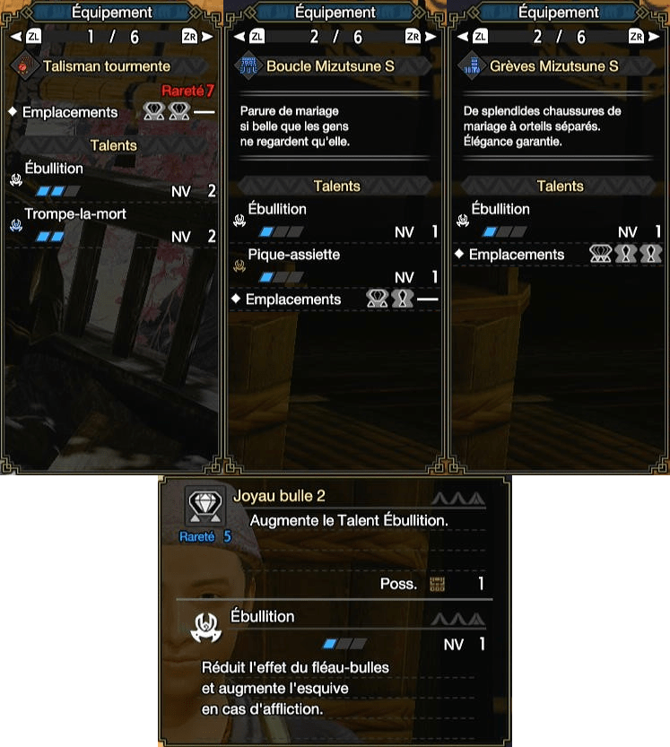 Dans Rise hélas, on a peu d’options. Le set Mizutsune a 3 pièces offrant chacune un point du talent avec des slots sympas notamment sur la tassette et les jambes. Mais votre salut viendra plutôt des talismans. Il est ainsi possible d’avoir directement un talisman Ebullition niveau 3 sur un talisman mais un talisman niveau 2 peut aussi faire l’affaire. Vous pourrez alors compléter le niveau manquant avec une décoration qui vous prendra un slot 2.