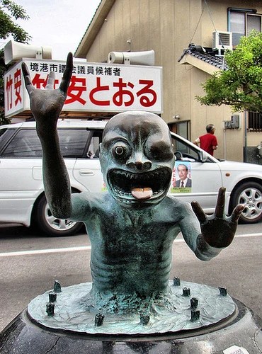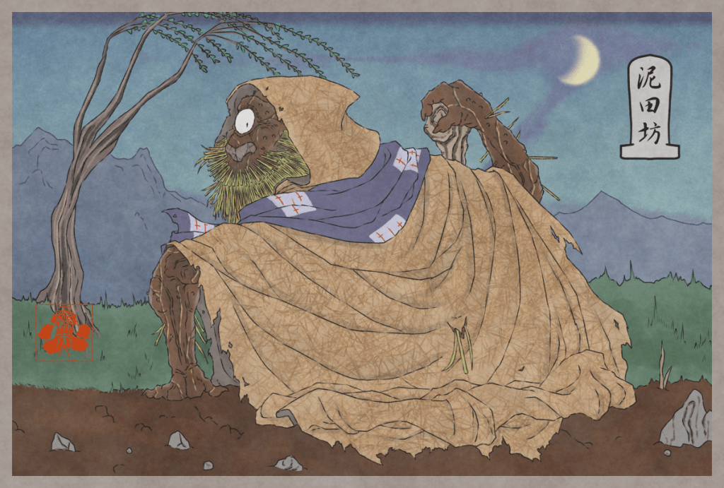 En apparence, c’est un mort-vivant borgne qui surgit de la boue, possédant trois doigts à chaque main. Dans la tradition japonaise, les 5 doigts de la main représentent 2 qualités, la compassion et la vertu, et 3 vices, la colère, l’avidité et l’ignorance. Il pointe les 3 doigts des vices à ceux qui désormais ruinent son héritage par ces mêmes vices. Il hanta le propriétaire du champ, l’implorant de lui rendre sa rizière, jusqu’à ce que ce dernier finisse par fuir et revendre le terrain à quelqu’un qui s’en occupa correctement.
