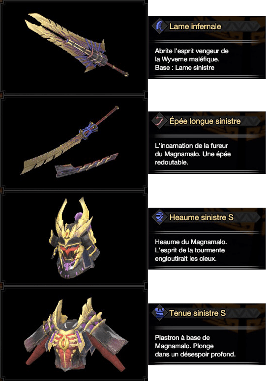 Et les sentiments de vengeance et de rage de l’onryo sont référés dans environ toutes les pièces d’armure et armes. On retrouve en plus dans l’armure deux talents assez parlant, j’ai nommé Vengeance et Cape feu de l’enfer (le talent lié à ses onibi). Le Magnamalo y est aussi souvent décrit comme la wyverne maléfique, un qualificatif approprié pour un onryo aussi puissant que Masakado. Ce motif est également présent dans son nom, composé de Magna, dérivé du latin magnus, grand et malo, le mal en espagnol. Le Magnamalo est ainsi littéralement le grand mal.