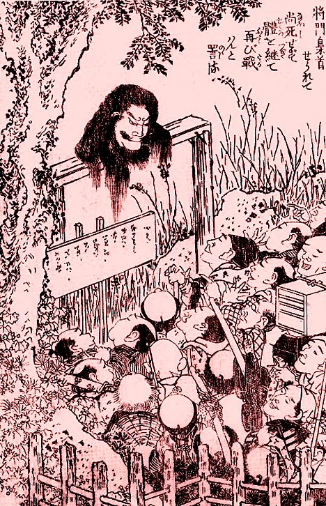 L’histoire pourrait s’arrêter là si la tête avait bien voulu pourrir. En effet, après plusieurs mois la tête de Masakado reste intacte. Ses traits semblent se muer en un rictus sinistre, ses dents grinceraient et une voix lugubre demanderait même le soir à ce que la dite tête soit rattachée à son corps. Et un beau jour… Cette même tête s’envola tout simplement, volant jusqu’à un hameau de pêcheurs loin à l’est de Kyoto, Shibazaki (la future Edo/Tokyo). Les villageois nettoyèrent l’étrange tête et l’enterrèrent, créant le temple de Kubizuka. Des rumeurs cependant disent que le spectre d’un samouraï est visible près du temple la nuit tombée.