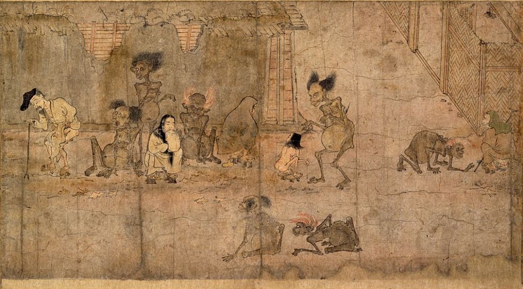 Dans la tradition bouddhiste, vous êtes réincarné après votre mort. Et c’est plus technique que l’idée reçue que vous redevenez un animal ou une plante. En effet, il existe différents plans de réalité, l’un d’entre eux étant le Gakido. Et si vous vous y réincarnez, c’est que vous n’avez pas été très sage. En effet, c’est une étendue de territoires inhospitaliers et désertiques qui vous attend. Vous-même deviendrez un gaki (餓鬼), un yokai misérable vaguement humain avec un gros ventre et une gorge atrophiée. Vous serez alors condamné à une faim éternelle et insatiable. Selon les versions, tout ce que vous ingérez brûle en vous instantanément, se changeant en cendre, ou vous pouvez quand même manger… Mais des cadavres, des excréments, du vomi, toutes ces choses sympas. Bref vous ne voulez pas finir au Gakido donc soyez sages.
