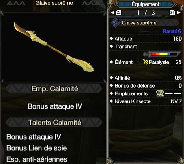 Sans surprise, on utilise ici l’IG Paralysie pour sa valeur de statut ultra élevée. Pour le talent Calamité, c’est au choix. En effet, Bonus attaque IV aide à palier un peu son raw faible avec un buff stable mais Bonus Lien de soie renforce les Wyvernes Plongeantes de 10%, un buff non négligeable à votre attaque la plus puissante (sauf quand vous la ratez quoi).