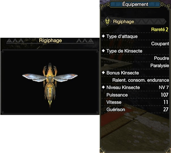 Une spécificité intéressante de ce build est de pouvoir jouer avec un kinsecte Poudre pour amplifier vos performances de statut. Si contrairement à un Baroudeur vous devrez un peu plus viser pour récupérer les 3 bonus, un kinsecte Poudre attaque le monstre en autonome une fois une marque de phéromone posée sur le monstre avec ZR, générant des nuages de statut que vous pourrez activer avec vos coups. Le Rigiphage est idéal pour cette tâche.