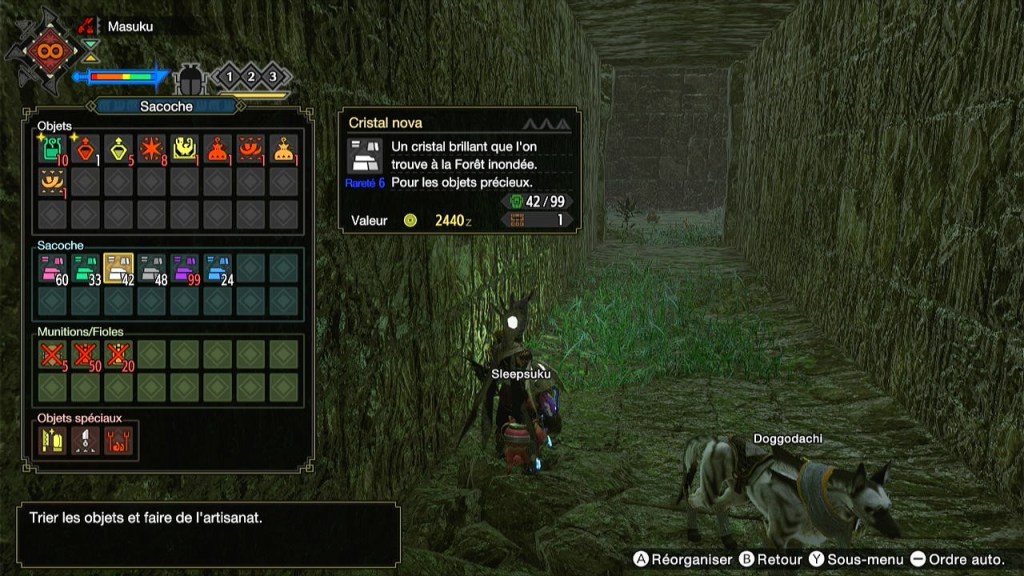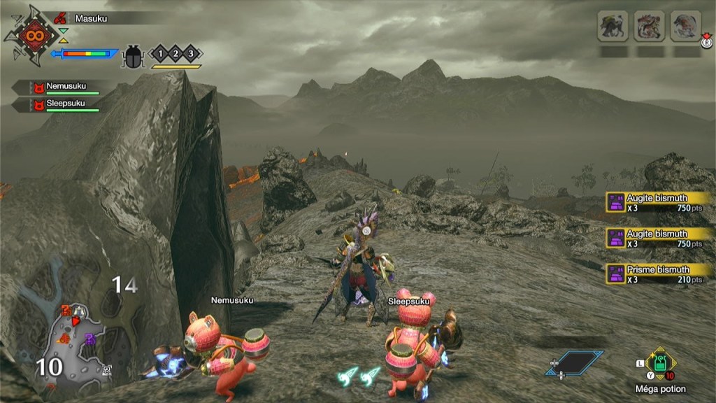 Si vous allez dans la carte en maintenant – , vous pouvez ensuite presser L ou R pour changer de filtre et ce filtre sera répercuté sur la carte de votre HUD. Une bonne solution pour repérer rapidement tous les points de minage ou à points à proximité mais également la faune locale à utiliser en combat ou les spectroiseaux avec les filtres correspondants. Et si le monstre s’enfuit, maintenir L vous affiche la carte dézoomée classique.