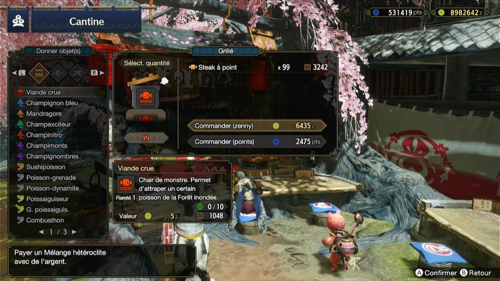 Alors oui effectivement comment accumuler autant de viandes crues pour faire le mélange? Eh bien il suffit de les acheter à l’Argosy sur la Place Pilpoil. Allez voir Rondine puis Échanger > Bric-à-brac et vous pourrez acheter des quantités colossales de viandes en échange de points Kamura. Et si vous avez un problème dans vos stocks de points, je vous renvoie sur le tuto sur le farming de points!