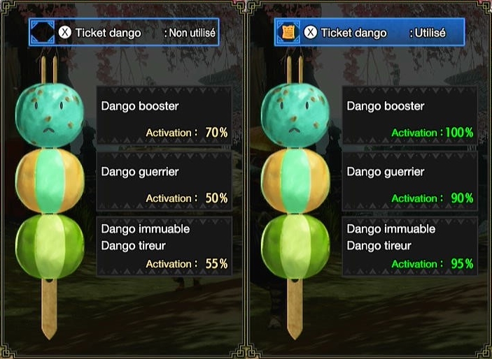 L’autre particularité de ce mélange, c’est que si vous allez voir Yomogi, elle vous récompense avec des tickets dango si vous le faites, pas moins de 44 quand vous vous contentez d’utiliser 99 viandes crues. De quoi faire un stock massif très facilement.