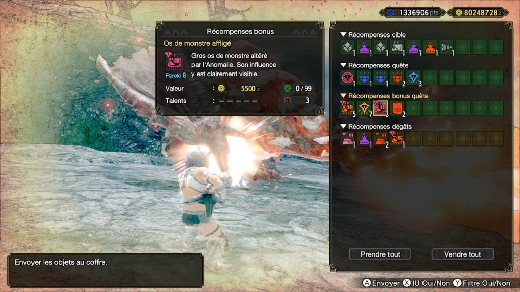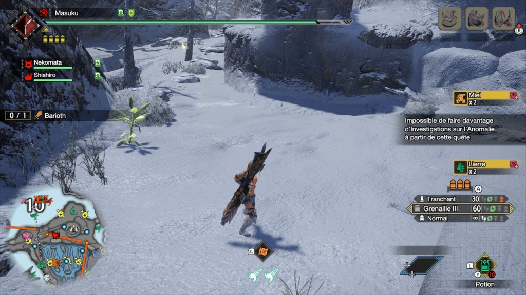 J’insiste sur l’aspect « pendant la quête ». Une fois la quête terminée et les monstres cibles chassés, il est impossible de récupérer de nouvelles investigations. Donc récoltez ce point de récolte contaminé que vous avez repéré du coin de l’œil avant de tuer le monstre sans quoi il sera gaspillé.