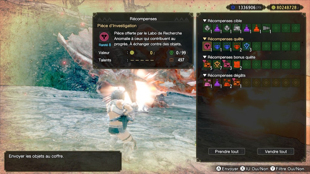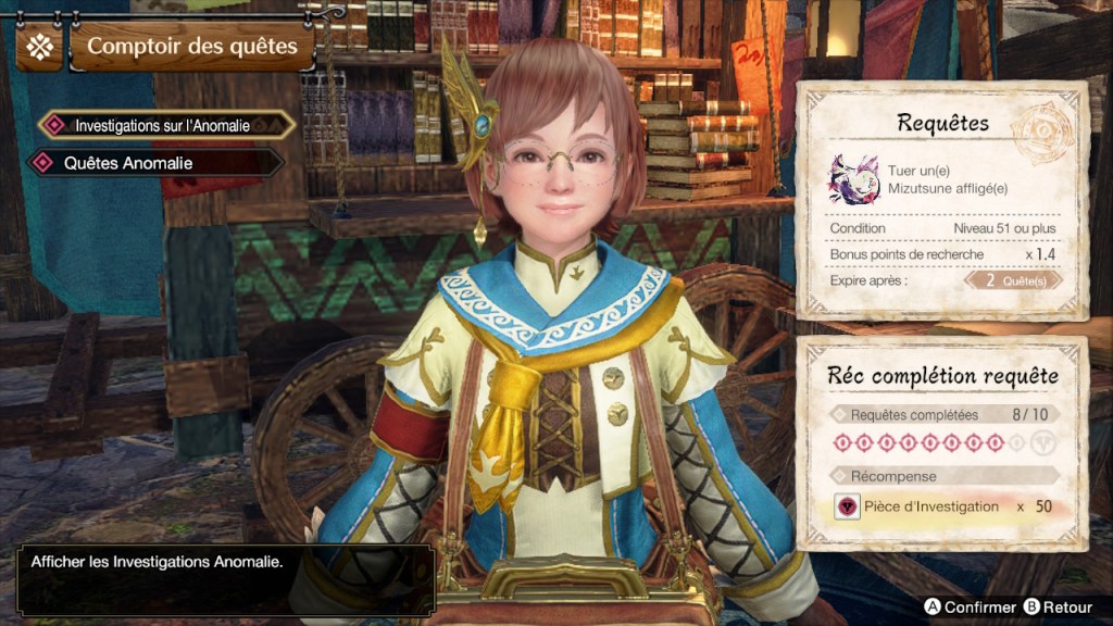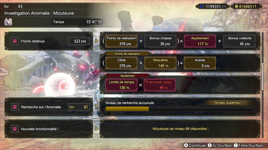 En effet, j’avais une Requête Mizutsune: au Comptoir des quêtes, dans le menu Quêtes Recherche sur l’Anomalie, vous aurez toujours une Requête qui change toutes les 3 à 5 quêtes, vous demandant de chasser un certain monstre à un certain niveau. Cette Requête booste vos récompenses de fin de quête et vous donne des tampons dans le menu en bas à droite, vous offrant une forte récompense en Pièces d’Investigation. Mon Mizu me rapporte donc 378 Points de réalisation.