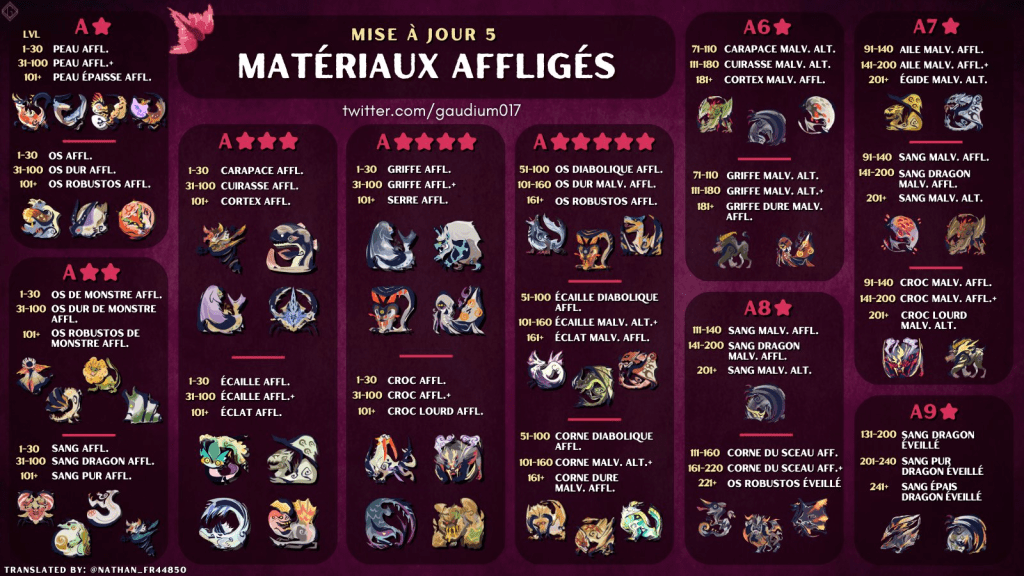 En fonction du niveau de votre Investigation, vous recevrez 3 versions différentes du drop affligé du monstre. Ces drop sont utilisés dans l’Artisanat Qurieux des armes.