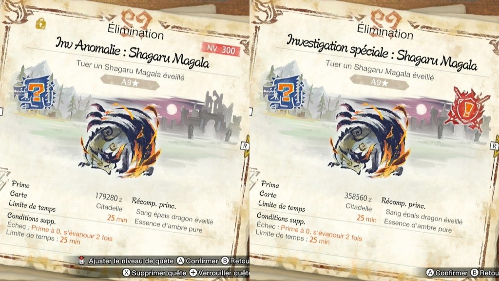 A noter également que les Investigations reçues pendant une quête concerneront des monstres avec un rang d’anomalie variant de +3 à -1 rangs du monstre chassé. Si l’Investigation reçue concerne un rang supérieur, elle perd 5, 10 voir 12 niveaux selon le rang à haut niveau. Dans le cadre d’un rang inférieur, elle a le niveau de la quête d’origine.