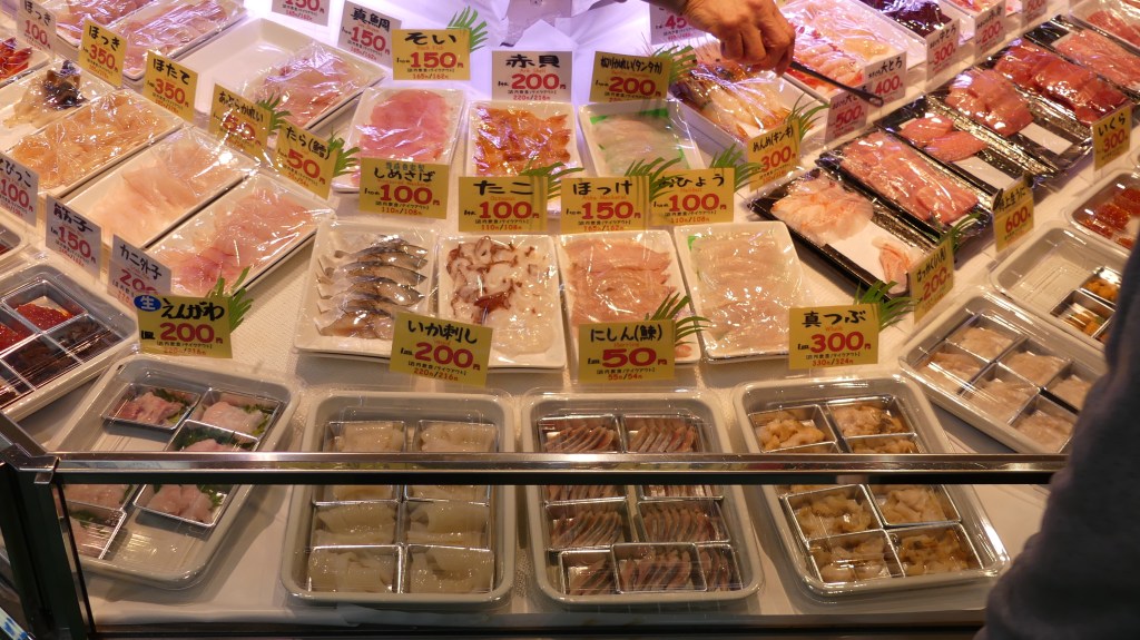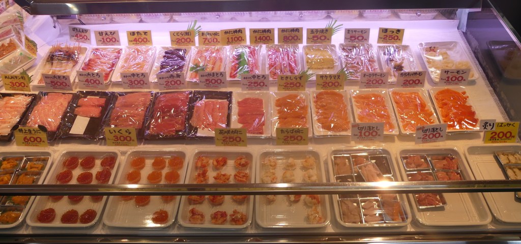 Vous pouvez alors acheter des portions de fruits de mer frais à ajouter dessus. Il est aussi possible de consommer directement ces mêmes produits en tant que sashimi. Les étiquettes jaunes viennent d’Hokkaido et celles avec une herbe de Kushiro.