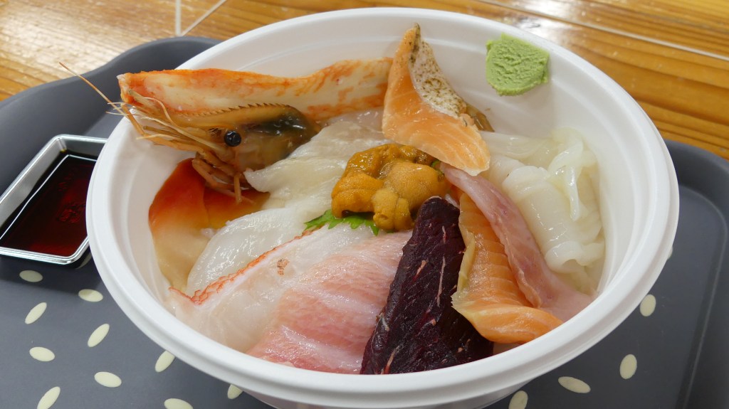 Le seul objectif de ma journée était d’essayer le katte-don du marché Washou. Situé près de la gare de la ville, le marché Washou a vu naître un plat local quand un motard sans le sou a rencontré un restaurateur généreux qui lui a fait payer un bol de riz avant de lui offrir tout un assortiment de fruits de mer locaux pour accompagner. De nos jours, la générosité est un peu passée à la fenêtre disons-le. Le concept du katte-don est donc assez simple : vous achetez un bol de riz, nature ou vinaigré, puis vous passez au stand!