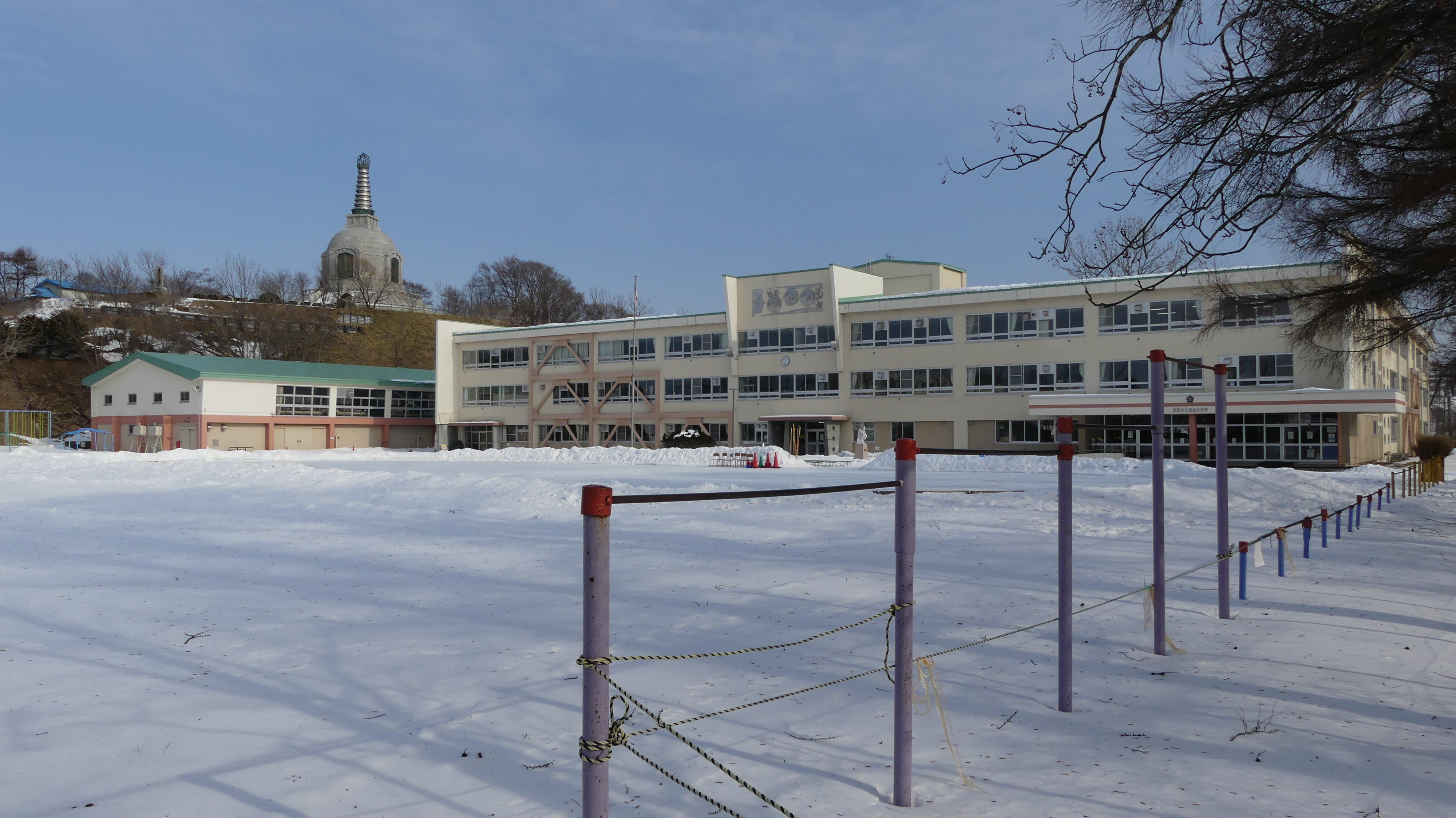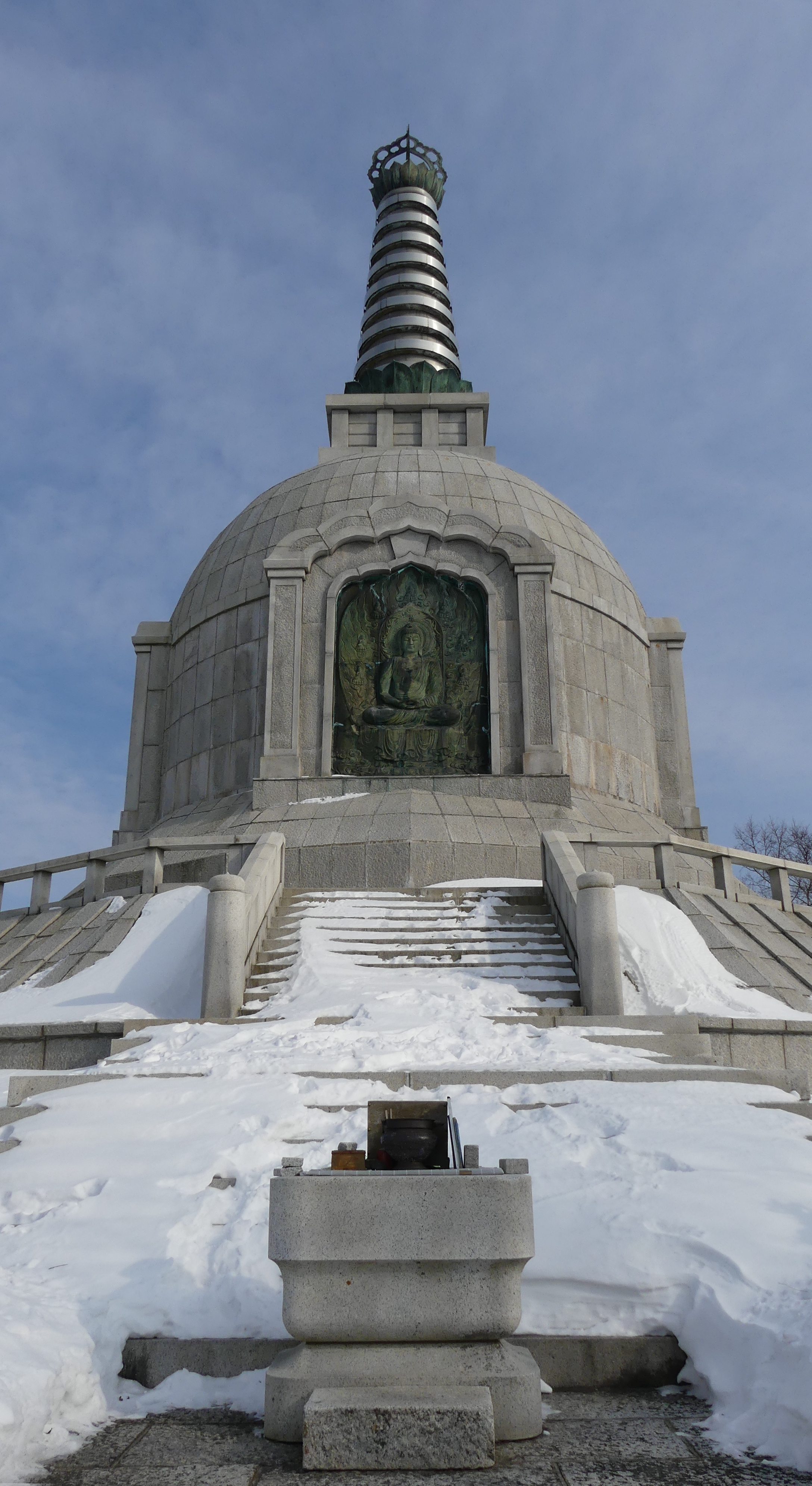 Après la traversée laborieuse du terrain de baseball d’une école enneigée, j’arrive enfin au lieu repéré, ce que j’ai considéré d’abord comme une pagode bouddhiste plutôt jolie avec quatre représentations du Bouddha aux points cardinaux. Après un peu de recherche, il s’agit en fait d’une stupa.