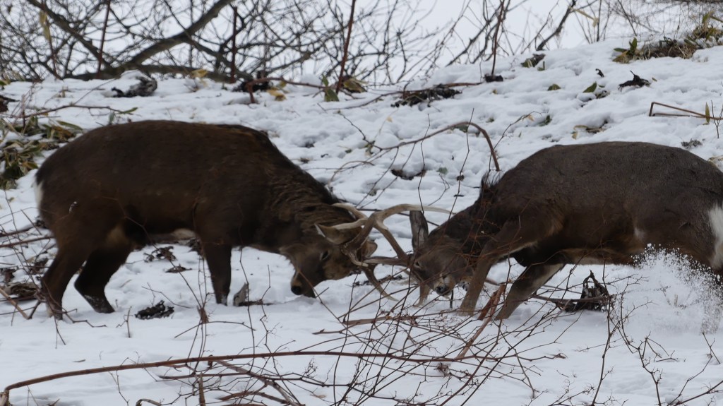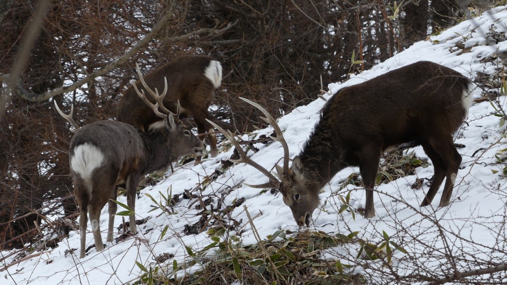 Sur la route, la batterie de mon appareil photo rend enfin l’âme. Fort heureusement, mon bagage est supposé arriver ce même soir au Airbnb, me permettant de la recharger pile au bon moment. J’ai fini celle-ci en apercevant un groupe de six cerfs sika yezo, broutant tranquillement sur une des pentes du parc. Tranquillement, c’est vite dit puisqu’ils s’affrontaient de temps en temps pour certains spots. Et c’est donc en essayant de photographier une de ces encornades que j’ai dû abandonner, faute de moyens.