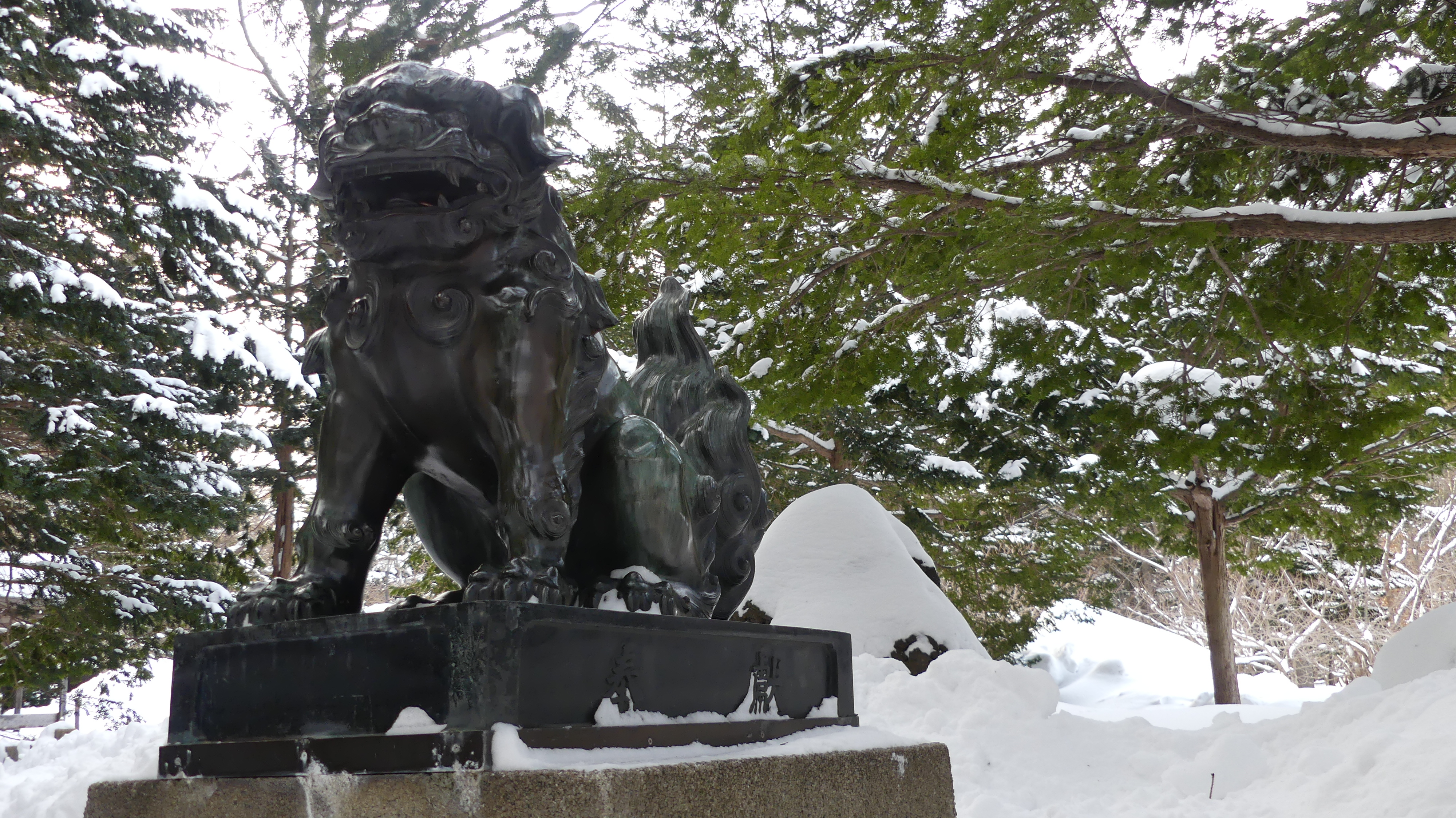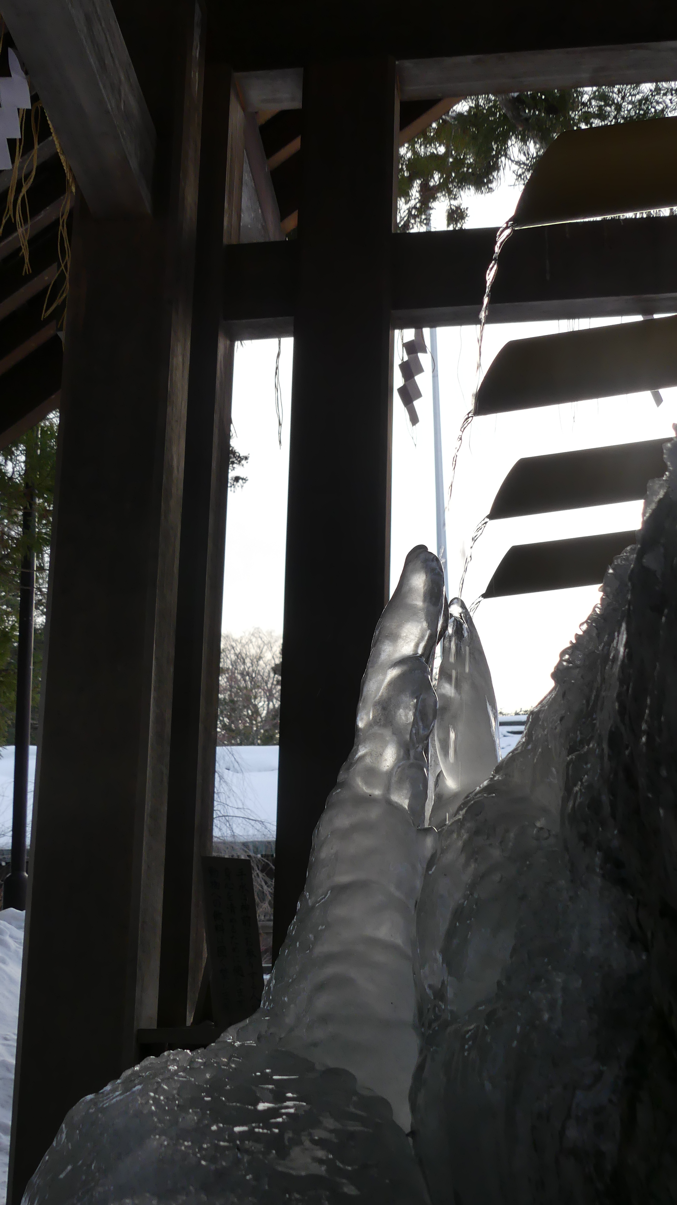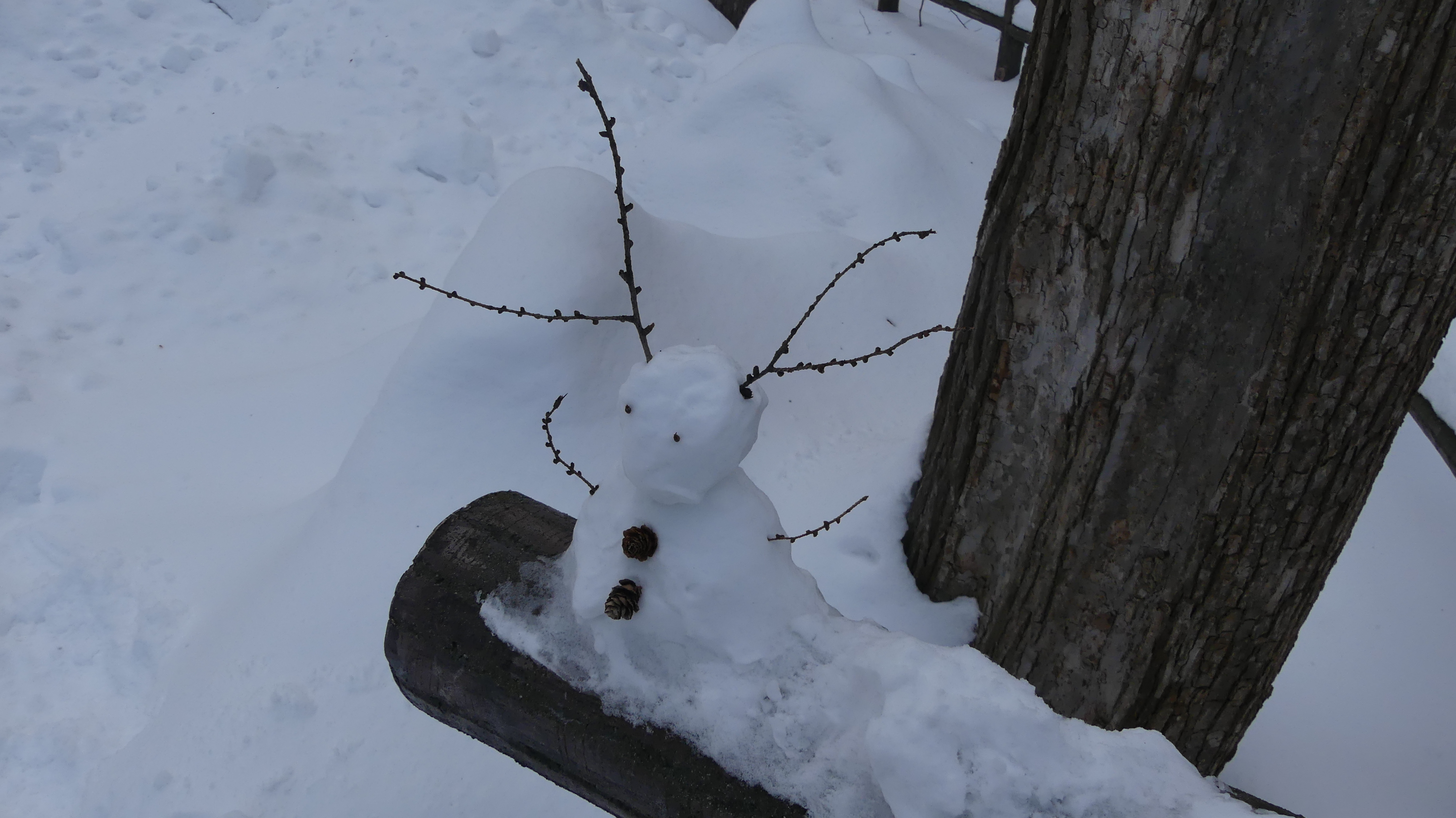 Le temple est situé dans le parc Maruyama où j’ai pu voir ces adorables bonhommes de neige miniatures, créés sur une rambarde de pont, ainsi que des silhouettes de neige crées directement sur des troncs d’arbre.
