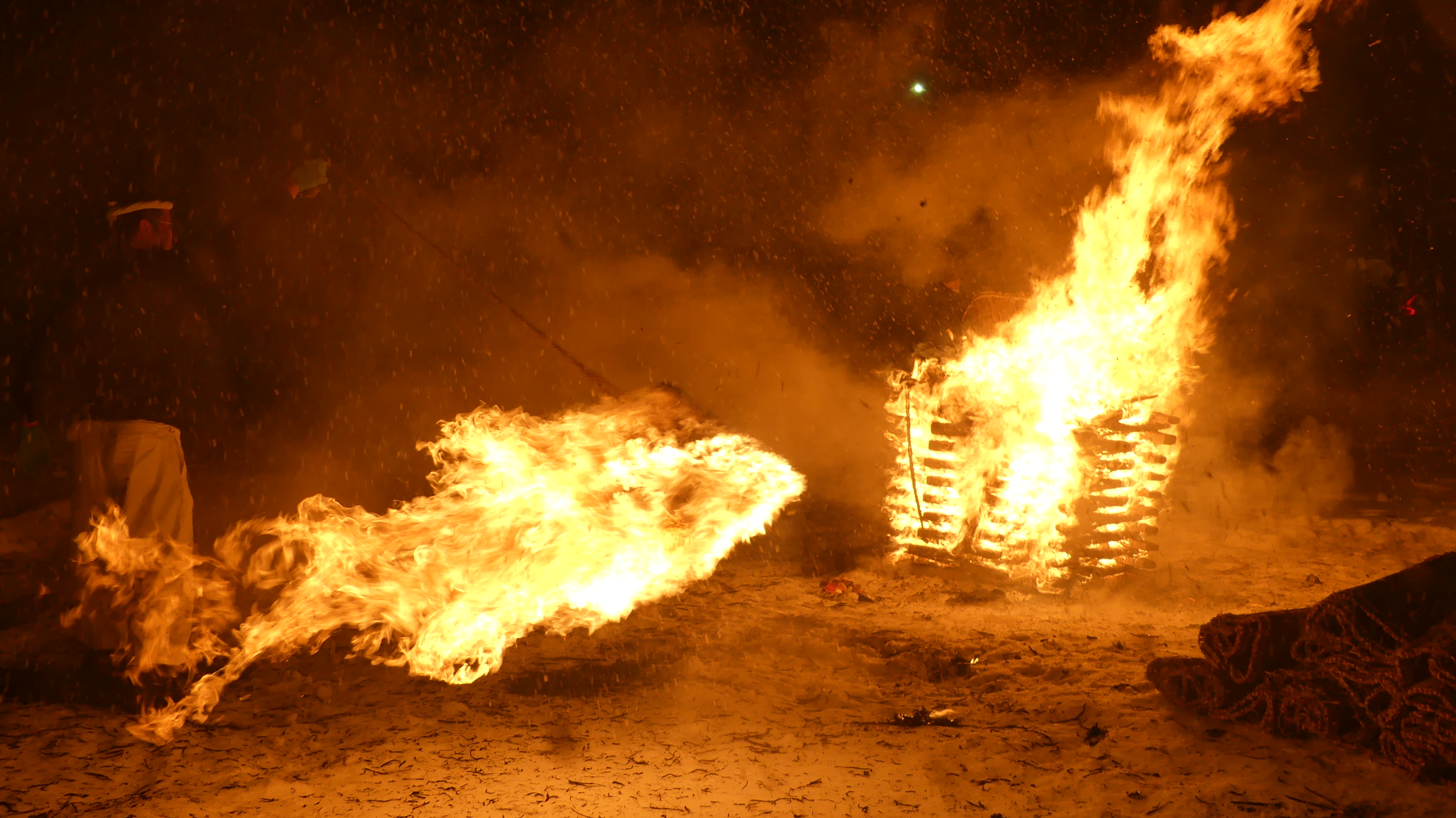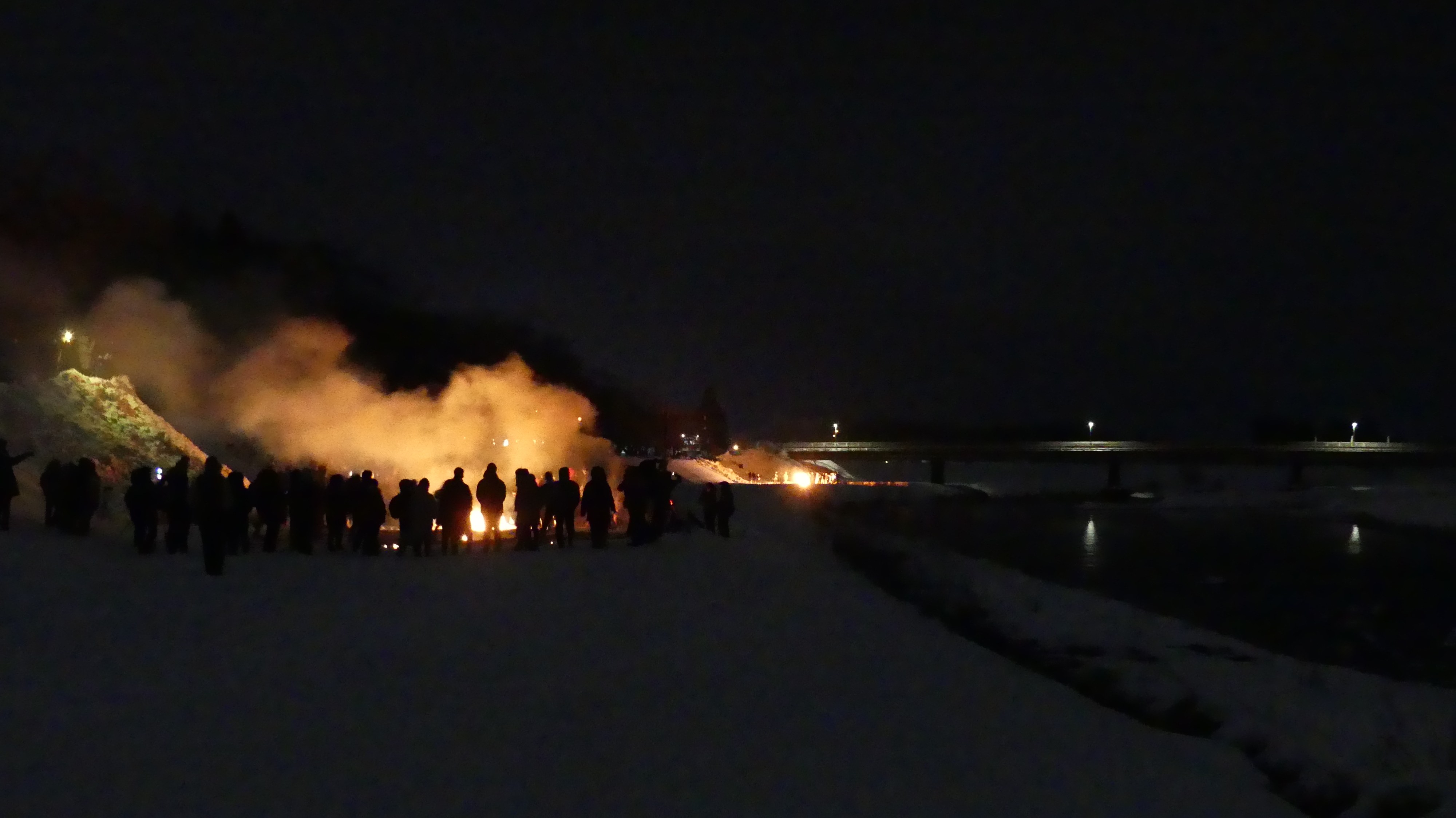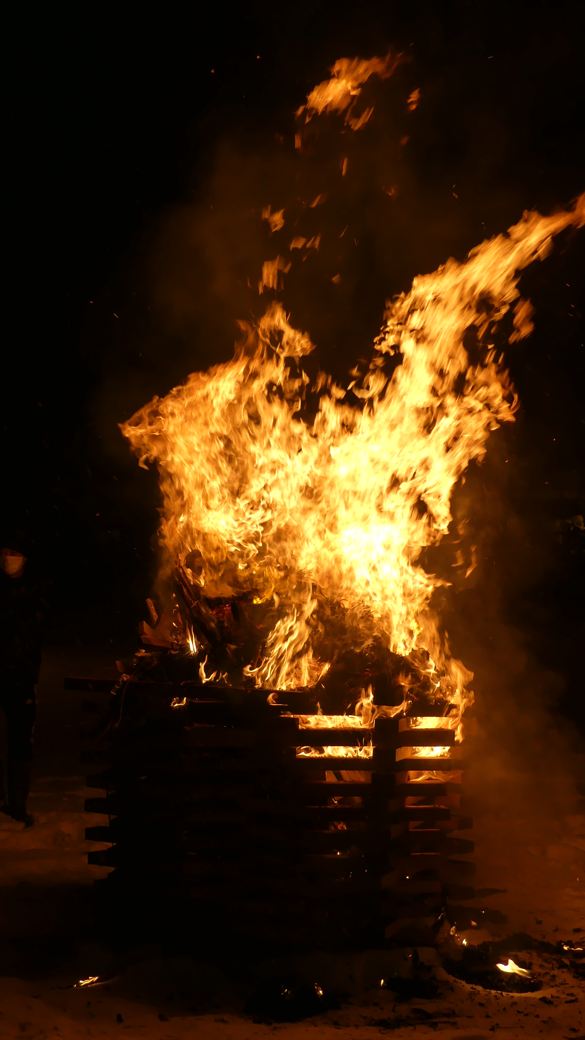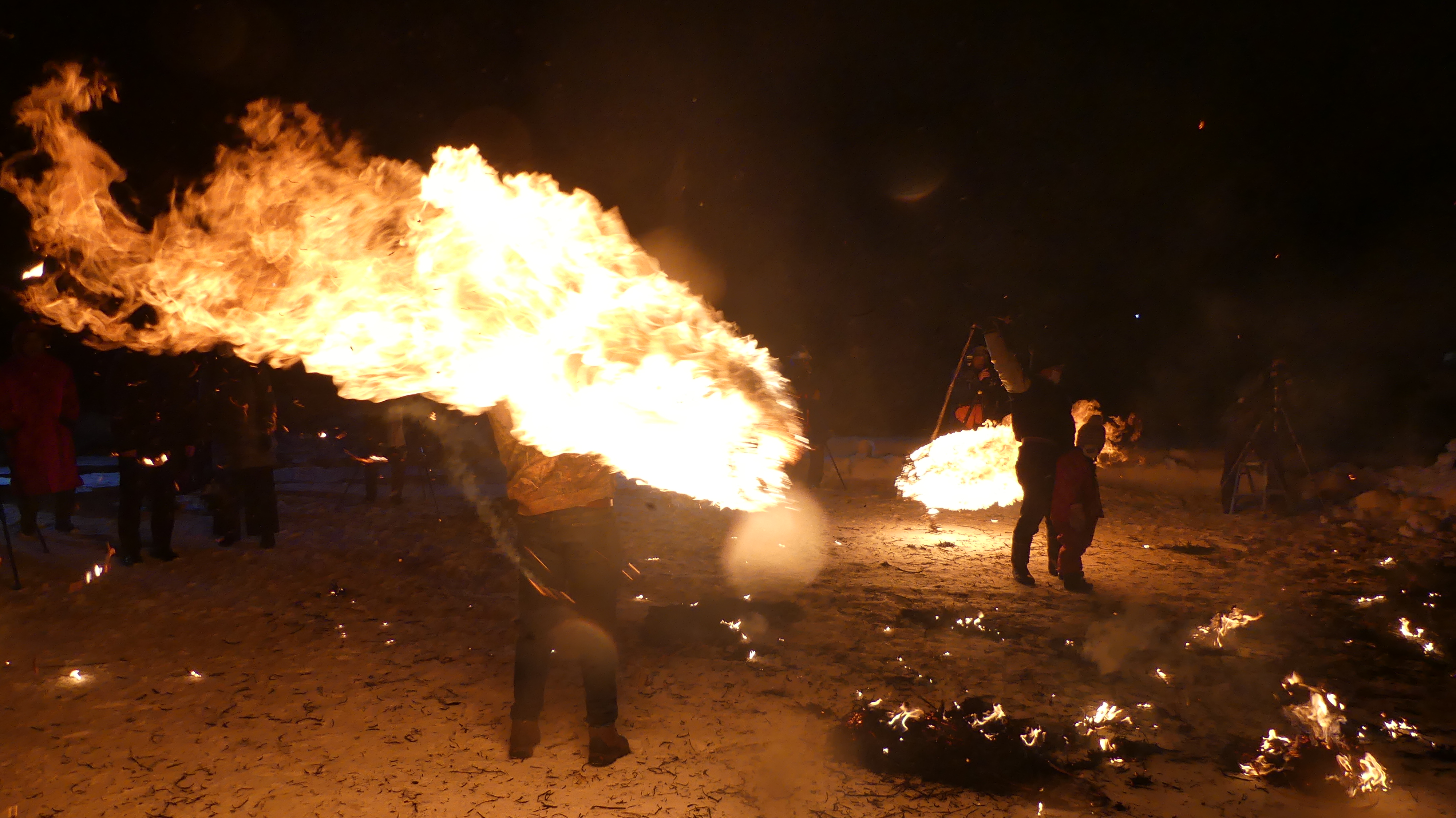 Ensuite, le principe est simple: on allume le bois sur le feu puis on fait tourner le combustible au bout de la corde. L’appel d’air avive les petites flammes et on se retrouve rapidement avec une boule de feu dansant au bout des bras. Les cordes finissent par se consumer et les restes de bois incandescents viennent s’écraser dans la neige juste à côté. Historiquement, c’était un rituel de purification pour la prospérité des champs mais de nos jours, tout le monde est clairement là pour s’amuser en jouant les pyromanes amateurs.