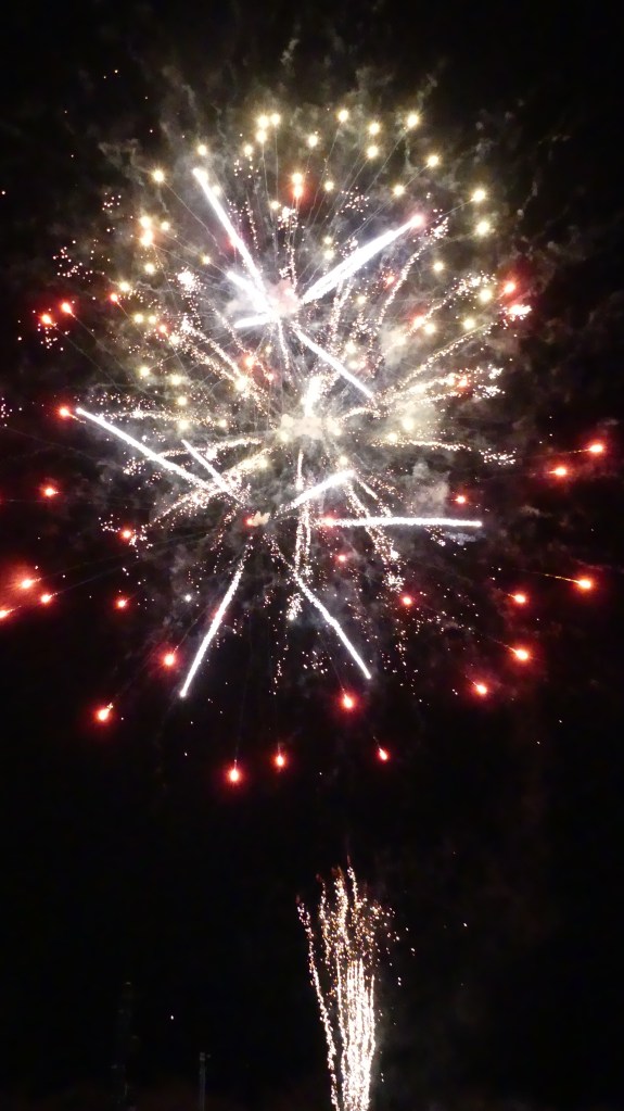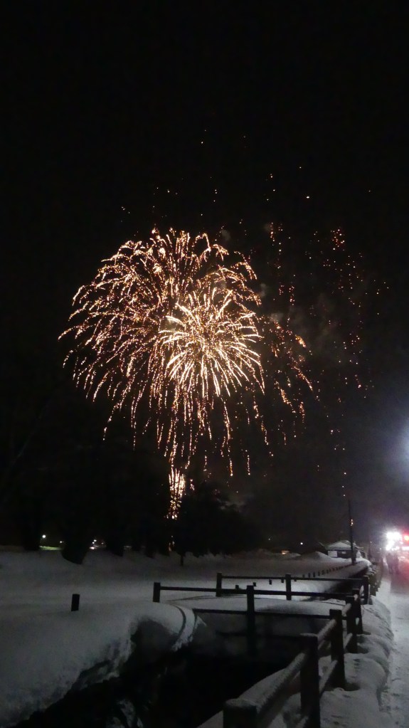 Après avoir essayé une fois, j’ai décidé d’aller jeter un œil aux autres scènes. Et il y en avait justement 3 le long de la rivière locale. Sur ma route, festival japonais oblige, j’ai pu admirer le feu d’artifice qui a eu un peu de mal à démarrer à cause de la neige qui tombait ce jour-là. Le début avait été ainsi ponctué d’explosions sonores sans lumière, j’imagine des tests pour voir si ça valait le coup de tirer.
