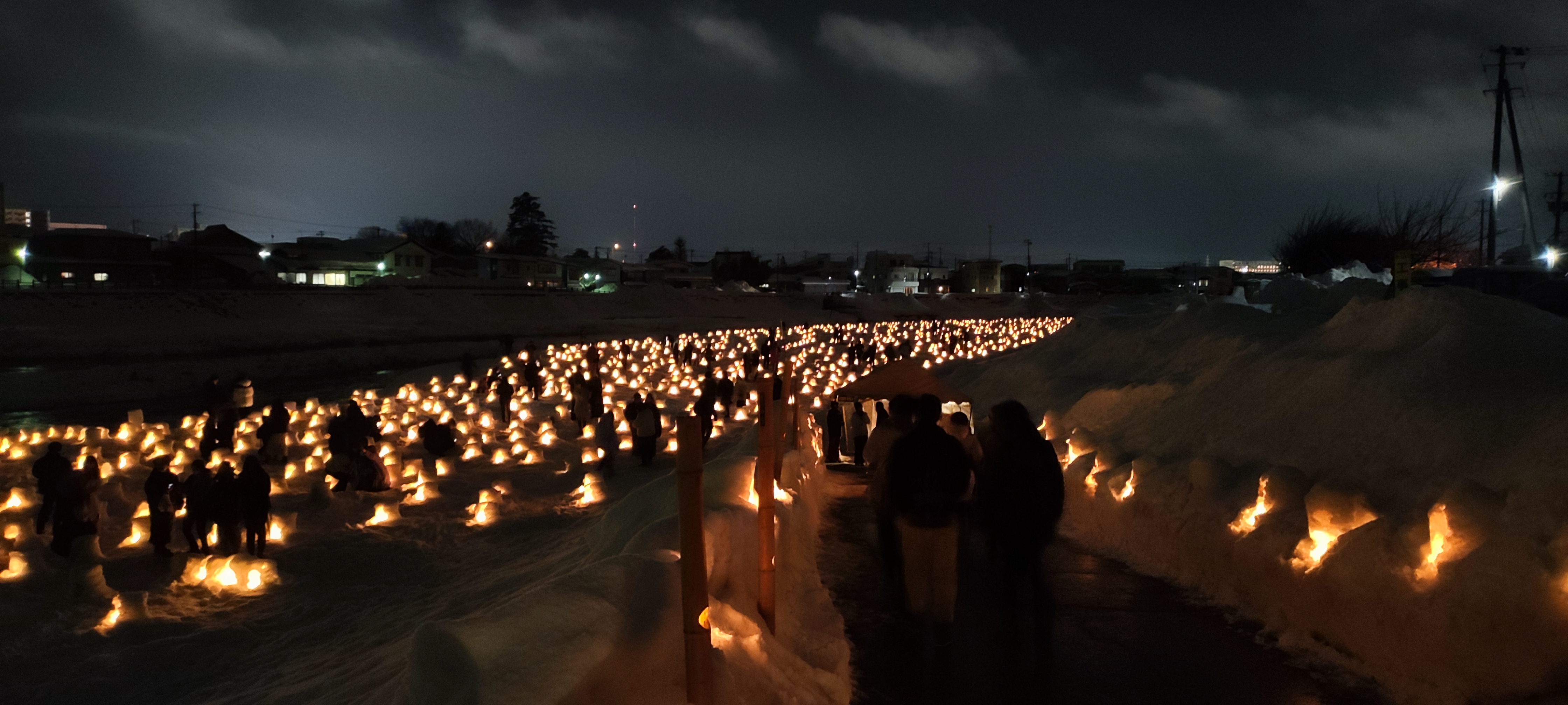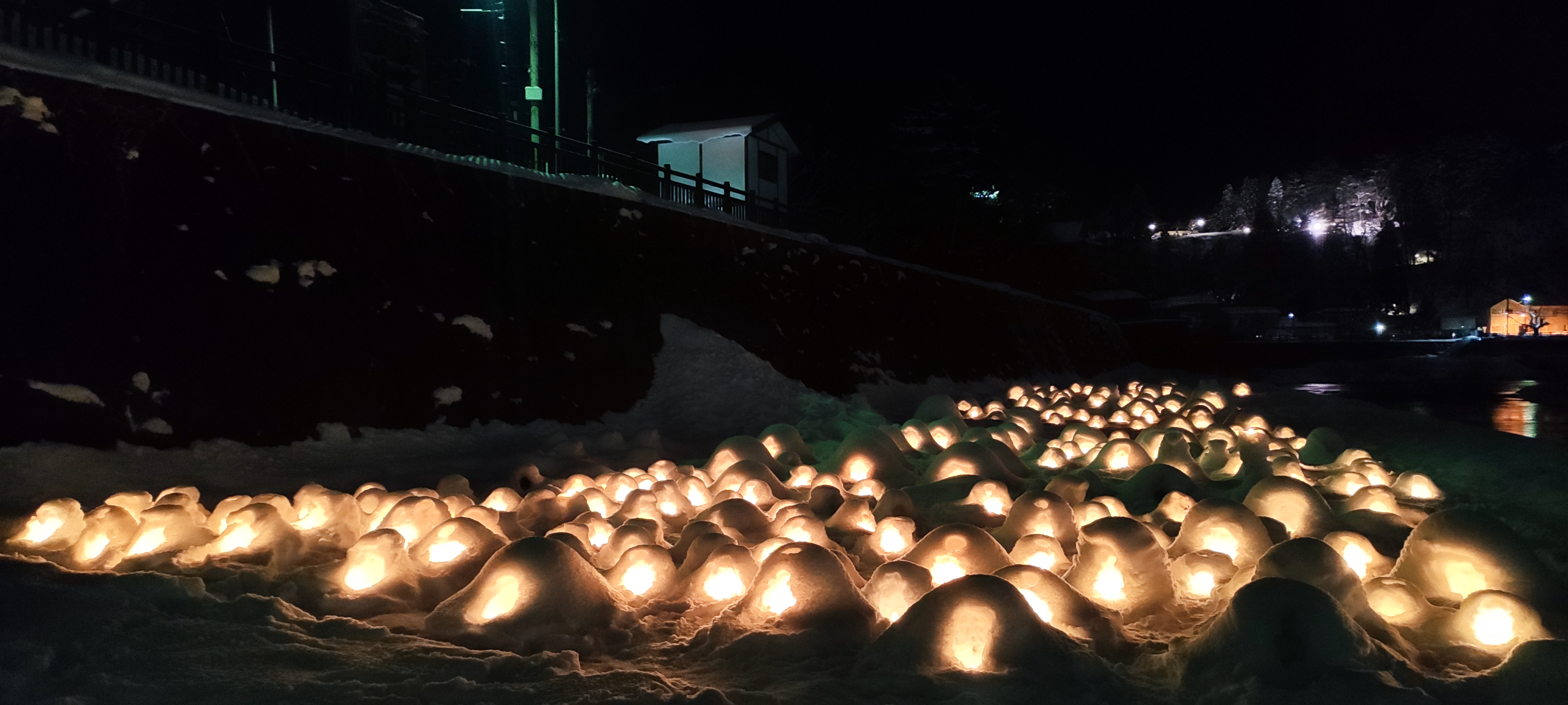 Au fur et à mesure que la nuit tombait, les kamakura s’illuminaient, permettant de repérer de loin la ‘voie lactée’ locale avec des centaines de petits igloos placés sur le bord de la rivière locale. Le château n’était pas en reste avec de superbes illuminations. J’ai pu déguster l’amazake, une des spécialités du festival, un saké doux.