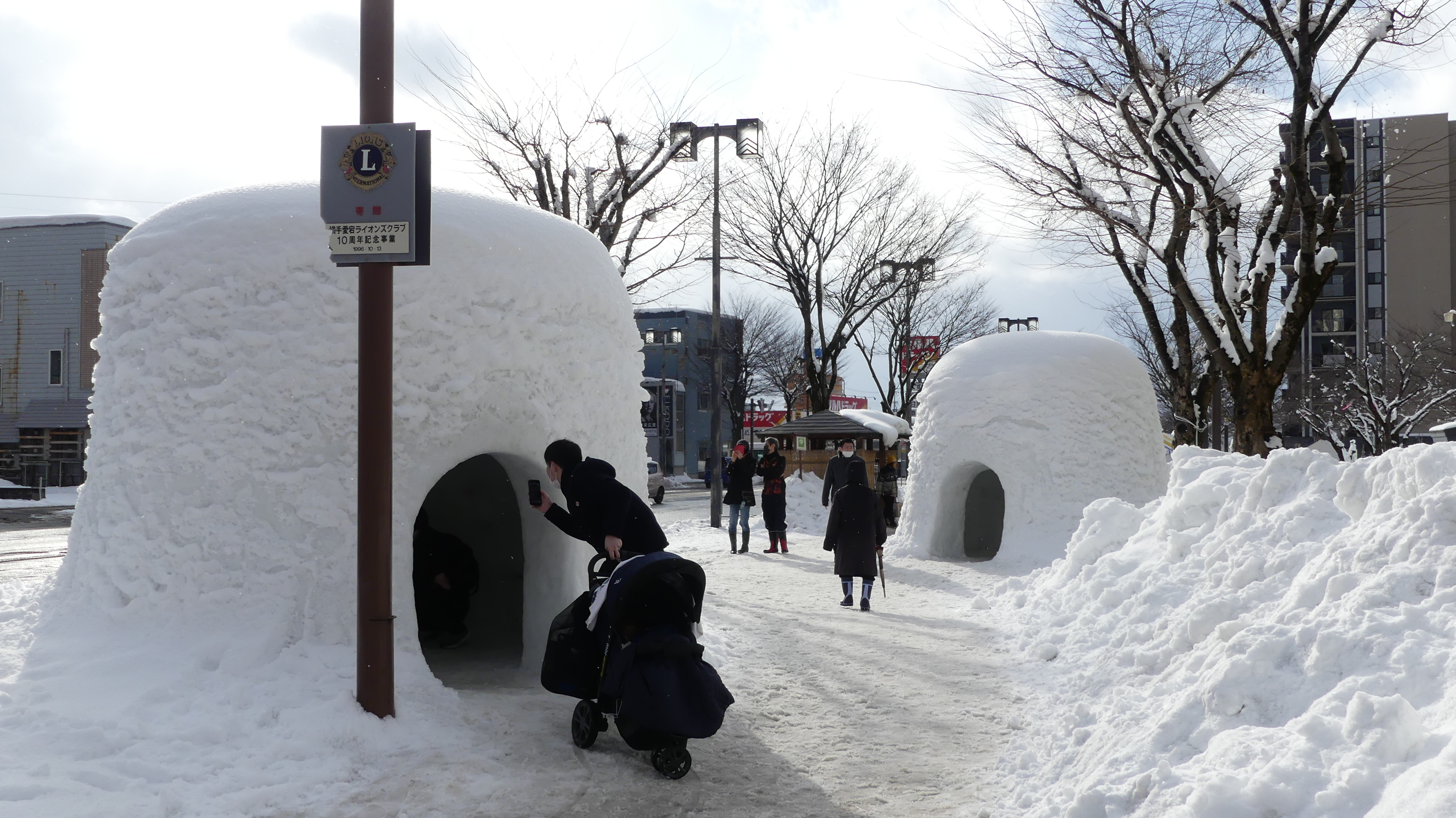 Le festival de Yokote est avant tout contemplatif, offrant des paysages sympas avec les kamakura. Quand j’ai quitté la gare, je me suis dirigé immédiatement vers le château local. Sur ma route, j’ai pu commencer à admirer certains des kamakura ainsi que des sculptures de neige.