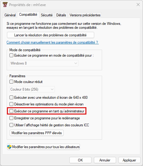 Une fois tout ceci fait, lancez le launcher mhf.exe. Ce dernier fait des modifs aux fichiers de Frontier à chaque lancement, il faut donc toujours le lancer en tant qu’administrateur sans quoi Windows s’emballe. Pour que cette option soit active par défaut, clic droit sur mhf.exe, puis Propriétés. Dans l’onglet Compatibilité, cochez Exécuter ce programme en tant qu’administrateur.