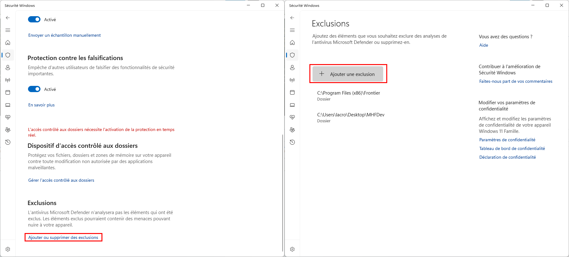 Ultime étape, réactivez la sécurité de votre ordinateur évidemment. Avant cela, dans ‘Paramètres de protection contre les virus et les menaces’, allez tout en bas dans Exclusions en cliquant sur ‘Ajouter ou supprimer des exclusions’ et créez une exclusion pour le dossier d’installation de Frontier. Cela évitera que votre ordinateur supprime les fichiers du jeu lors d’un scan de sécurité de routine.