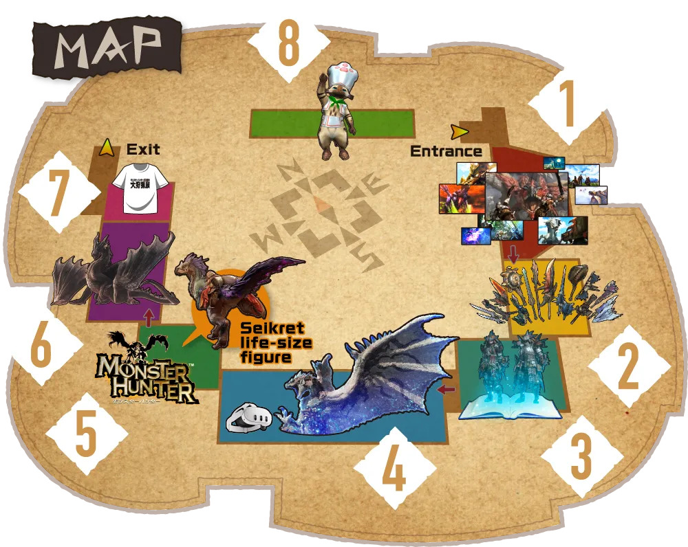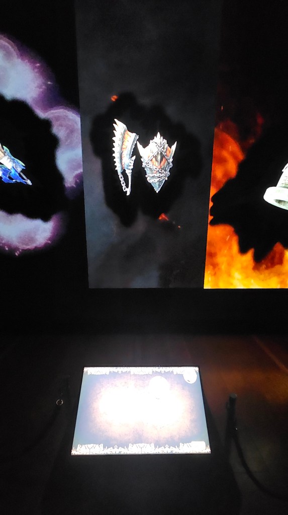 Peut-être l’espace le plus décevant. Après être sorti du cinéma, on se retrouve dans une pièce sombre avec 14 bornes, une par arme. On peut alors faire défiler les armes qui sont projetées sur des surfaces reprenant leurs formes. Sauf que c’est chronométré avec des tours d’une minute, ce qui est court (très court pour le coup) et qu’en plus ce ne sont que les renders de World et Iceborne (aka pour la moitié les designs slap-on où on dirait que des bouts de monstres ont été collé sur les armes os et minerai). Du coup petite déception.