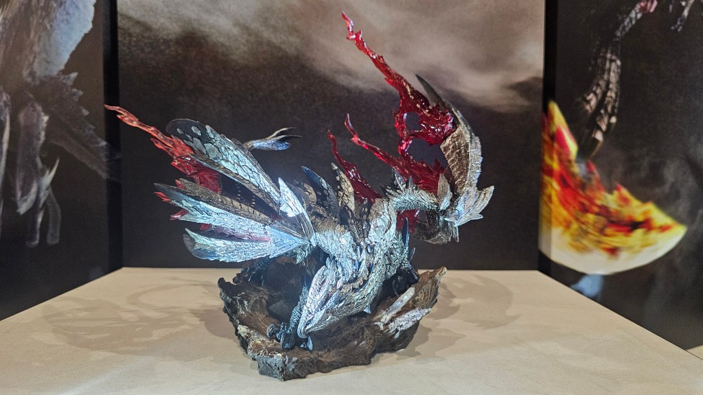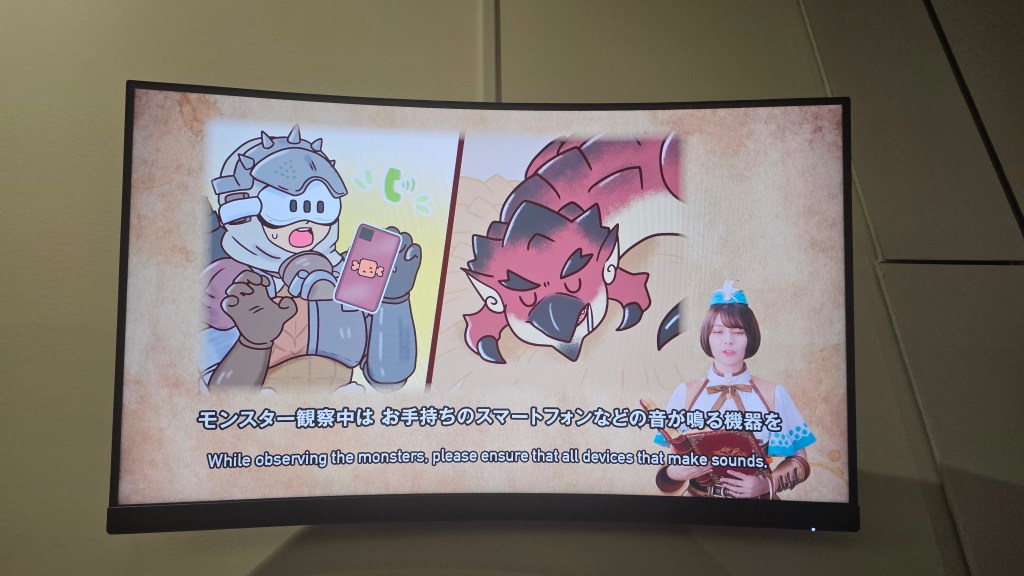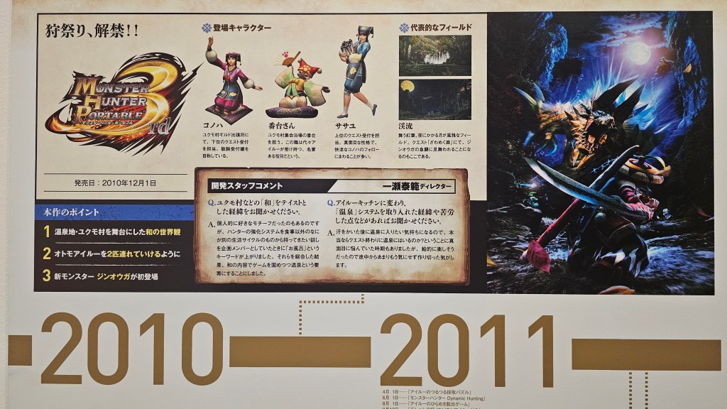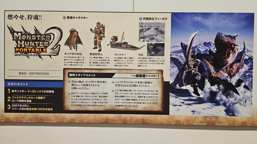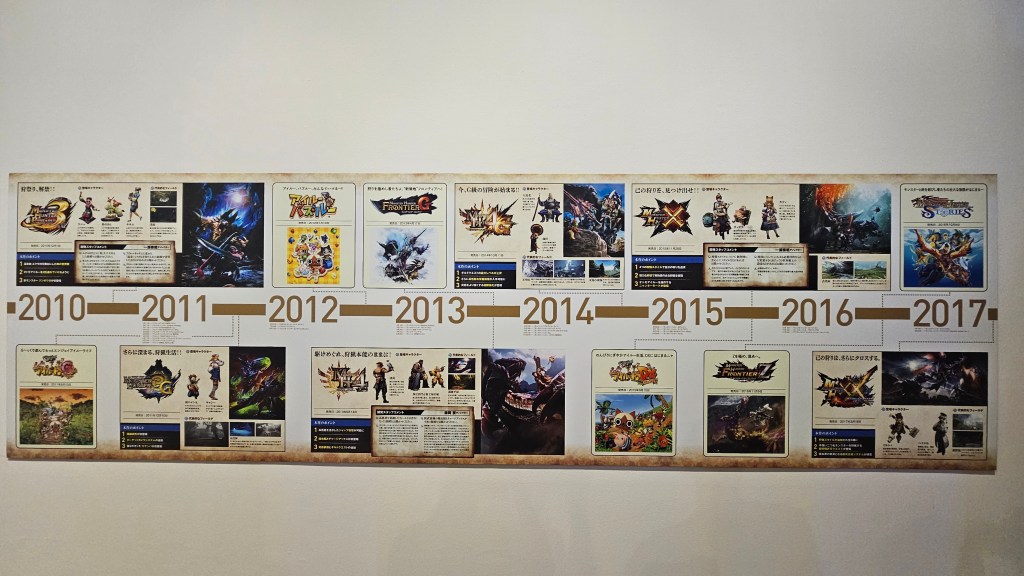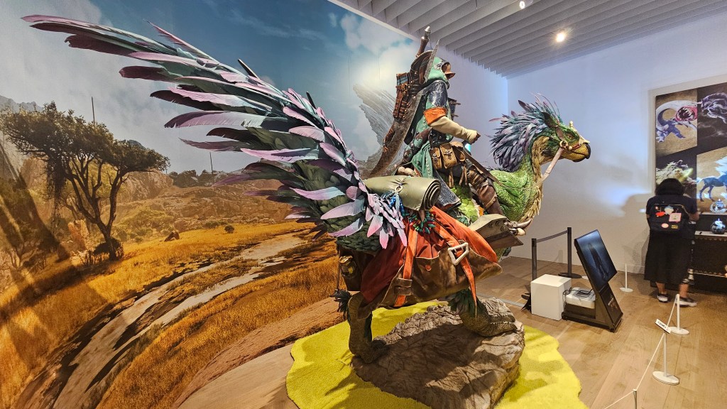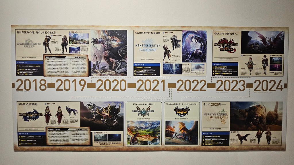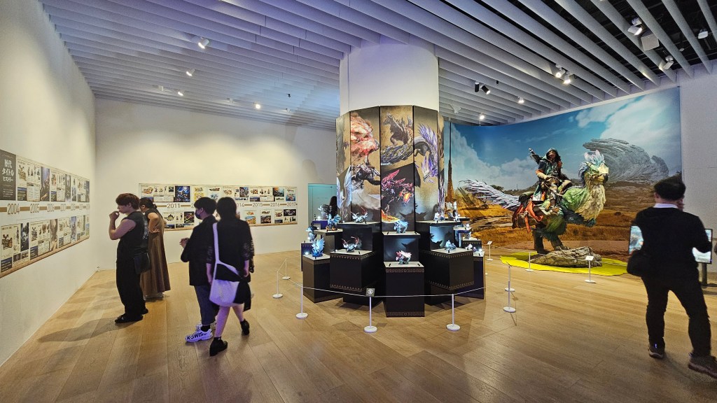 Outre ces statuettes, il est possible d’apprécier une frise chronologique de la licence avec des petites interviews revenant sur les nouvelles features introduites par chaque opus (pour quiconque maîtrise le Japonais ou Google Trad) mais également une statue grandeur nature du chasseur de MHWilds avec son fidèle Seikret, à côté d’un écran passant les 2 trailers sortis du jeu.