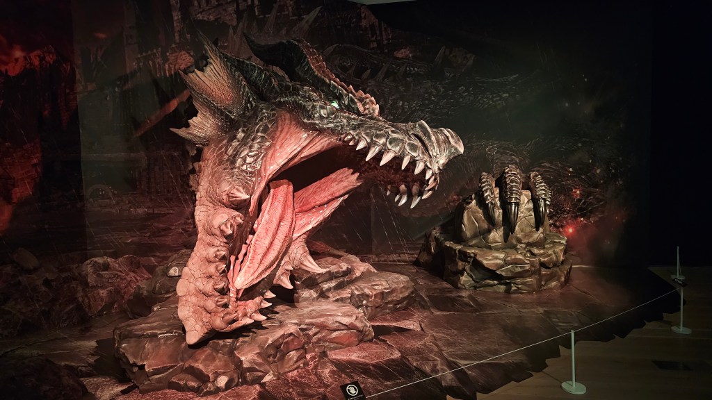 Ultime étape de l’exposition, c’est une statue grandeur nature du Dragon Noir Fatalis qui attend les chasseurs. J’avais assez peu d’attente, n’étant pas un grand fan du design de la bête de base mais je dois reconnaître que j’ai été assez impressionné par le Dragon Ancien tout droit sorti de Schrade pour dévorer les visiteurs de l’exposition.