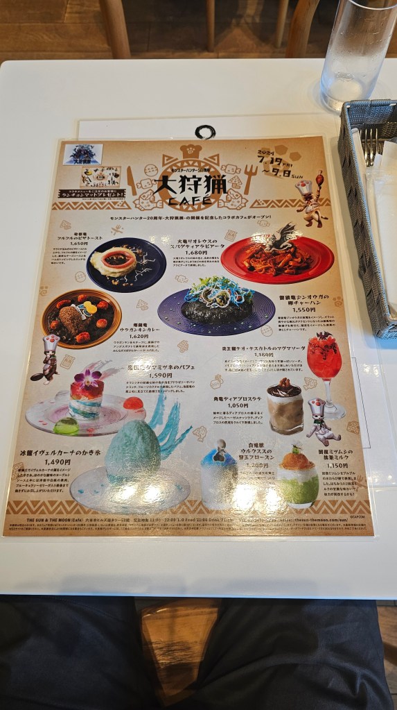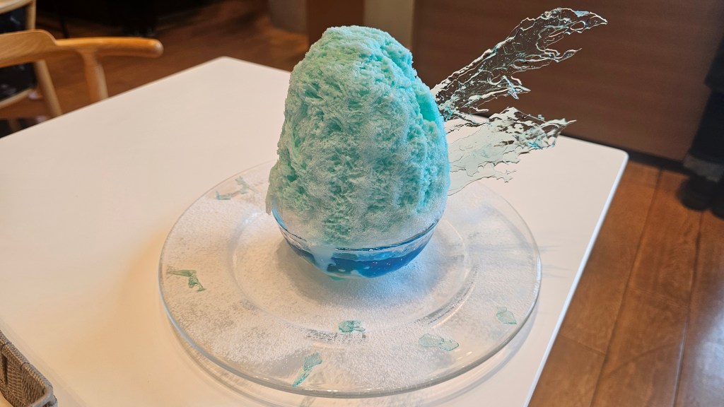 Et pour finir, j’ai pu déguster un énorme kakigori Velkhana qui cachait sous sa couche de glace finement pilée au yaourt encore un peu de gelée au curaçao bleu avec des morceaux de poire et de pêche blanche.