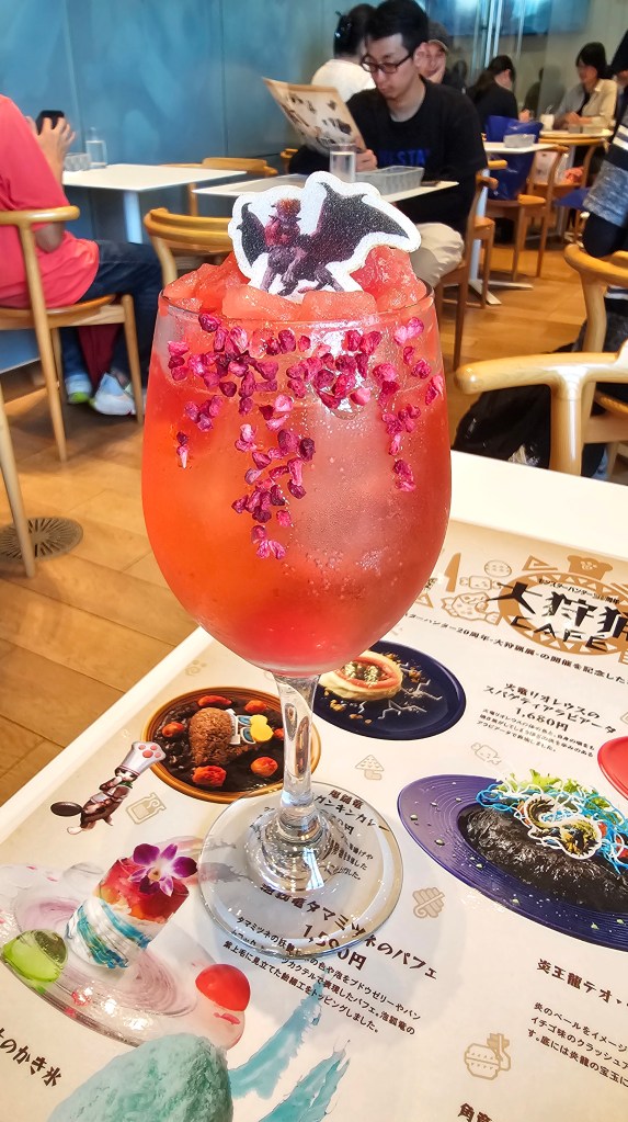Une heure d’attente plus tard, j’ai donc fait face dans un premier temps au plat Khezu, deux petites pizza superposées avec du jambon et des poivrons avec par dessus une crème au fromage et du prosciutto. Accompagné d’une boisson Teostra fraise aux glaçons grenade avec au fond une cerise jouant le rôle d’un Joyau Teostra.