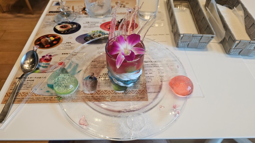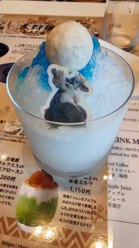 Ensuite, vu que mon estomac était déjà bien rempli, j’ai décidé d’enchaîner sur des glaces et des boissons. Dans un premier temps, c’est une boisson glacée au Calpis et au litchi sur laquelle trônait un Lagombi avec sa boule de neige sablée qui s’est présentée devant moi.